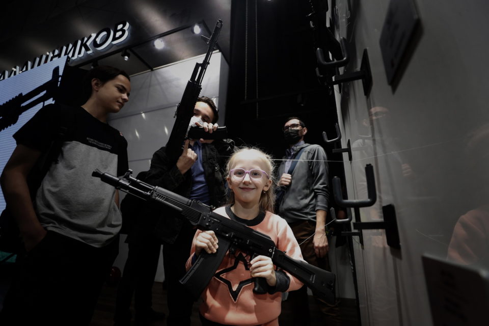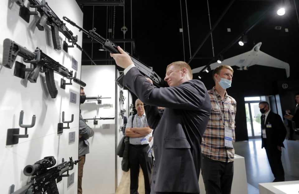 Επισκέπτες δοκιμάζουν αυτόματα όπλα τελευταίας τεχνολογίας στο περίπτερο του Ομίλου Καλάσνικοφ.