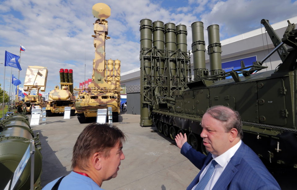 Επισκέπτες συνομιλούν μπροστά από ρωσικά αντιαεροπορικά πυραυλικά συστήματα Antey 4000, στο περίπτερο της ρωσικής κρατικής βιομηχανίας όπλων JSC Concern VKO Almaz-Antey. Μόσχα, Ρωσία, 23 Αυγούστου 2021