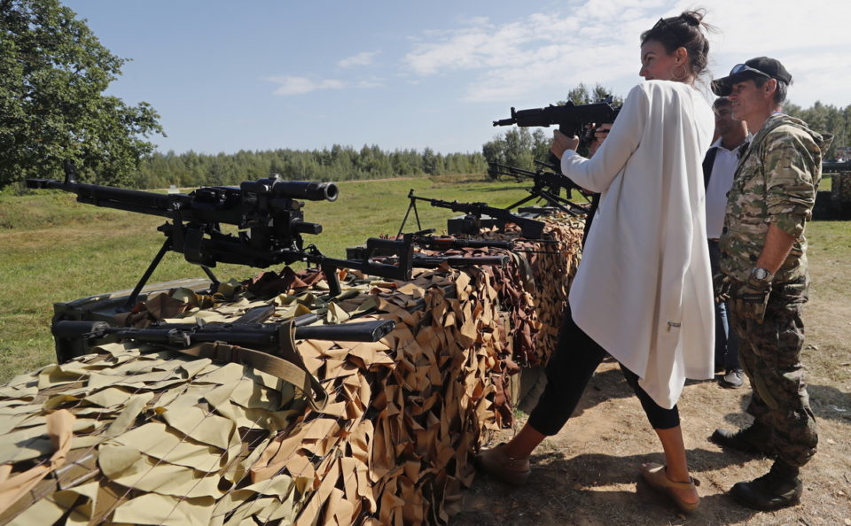 Επισκέπτρια δοκιμάζει αυτόματο οπλοπολυβόλο σε πεδίο βολής στο Διεθνές Στρατιωτικό-Τεχνικό Φόρουμ Army-2021. Μόσχα, Ρωσία, 28 Αυγούστου 2021