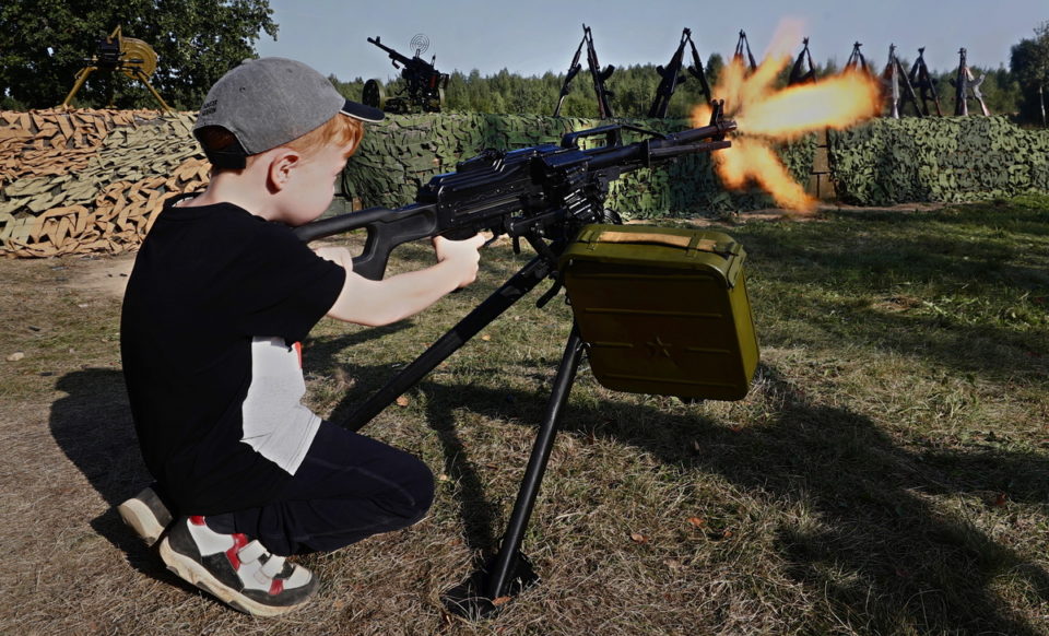Μικρό αγόρι ρίχνει βολές με όπλο γεμάτο με κενά φυσίγγια, στο Διεθνές Στρατιωτικό-Τεχνικό Φόρουμ Army-2021. Μόσχα, Ρωσία, 28 Αυγούστου 2021