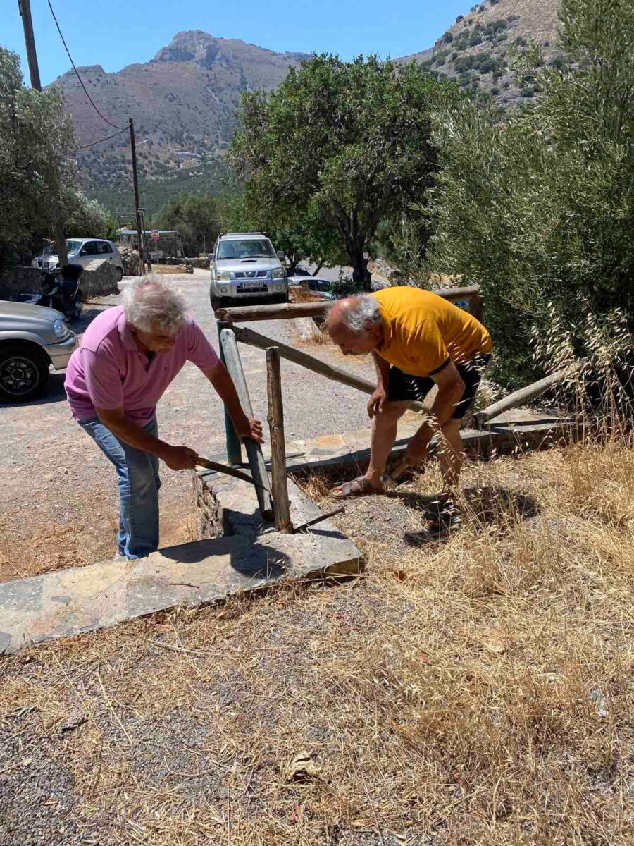 Αρκετοί συνεισέφεραν με προσωπική εργασία. Στο μικρό πλάτωμα όπου θα τοποθετούνταν οι κούνιες, υπήρχε παλαιότερα παιδική χαρά. Τώρα το σημείο παρουσίαζε μια θλιβερή εικόνα εγκατάλειψης. Σήκωσαν λοιπόν τα μανίκια, καθάρισαν αγριόχορτα και σκουπίδια, επισκεύασαν μόνοι τους την ξύλινη περίφραξη και την έβαψαν. Κλάδεψαν αριστοτεχνικά τη μεγάλη ελιά στο κέντρο, για να τραμπαλίζονται πια με ασφάλεια τα παιδικά γέλια στα κλαριά της.