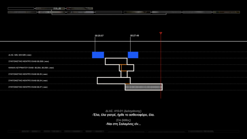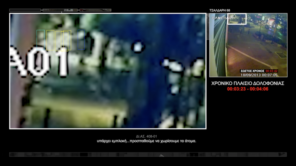 Το πρώτο που επρεπε να κάνουμε είναι να εντοπίσουμε τον ακριβή χρόνο της δολοφονίας. Ναι μεν υπήρχε υλικό από κάμερες, όμως άλλες έδιχναν ότι ήταν 2008 κι άλλες ότι ήταν 14.00 το μεσημέρι. Μια πρωτοτυπία όμως της δίκης είναι ότι ο εισαγγελέας ζήτησε τις διαβιβάσεις των αστυνομικών προς το κέντρο. Επομένως, υπήρχε μια βάση ως χρονική αφετηρία κάτι που μας βοήθησε -συγχρονίζοντας οπτικό κι ακουστικό υλικό- να βάλουμε τα γεγονότα στη σειρά. Η άφιξη του ασθενοφόρου μας έδωσε άλλο ένα “αδιαμφισβήτητο σημείο αναφοράς” προκειμένου να στηθεί το χρονικό πλαίσιο. Και η άφιξη του Ρουπακιά με το αυτοκίνητο (που κινείται για λίγο στο αντίθετο ρεύμα) μας έκανε να υπολογίσουμε ότι ο φόνος έγινε μεταξύ 00.03’23’’ – 00.04’06”. Πιο πριν στον Παύλο, που έχει μείνει πίσω σε σχέση με τους φίλους του, επιτίθενται ανά μικρές ομάδες».