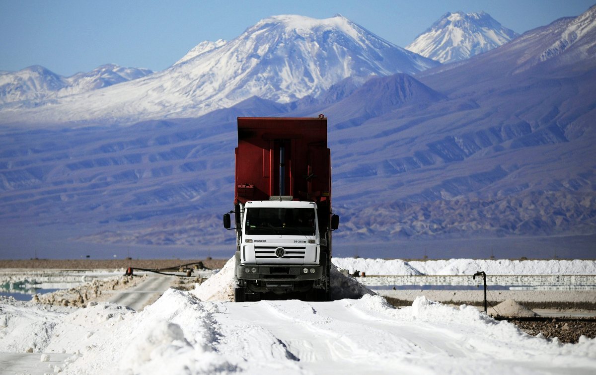 Φορτηγό σε μια ζώνη συλλογής αλατιού της Χιλιανής Εταιρείας Λιθίου στην έρημο Salar de Atacama, μια από τις σημαντικότερες πηγές λιθίου στον κόσμο, στην Calama της Βόρειας Χιλής, 22 Ιουνίου 2012.