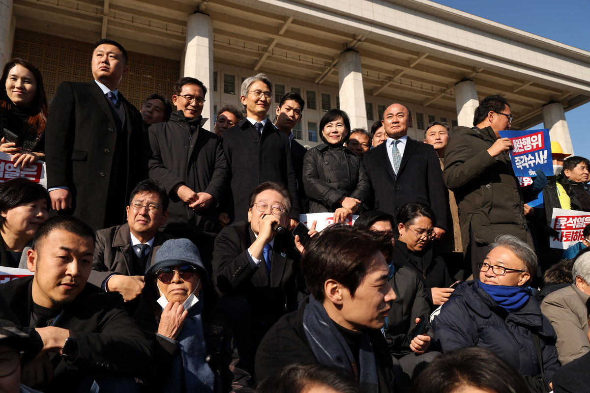 epa11755913 Ο Λι Τζε-Μιουνγκ (κέντρο), ηγέτης του αντιπολιτευόμενου Δημοκρατικού Κόμματος, μιλά στους υποστηρικτές του μπροστά από την Εθνοσυνέλευση στη Σεούλ.