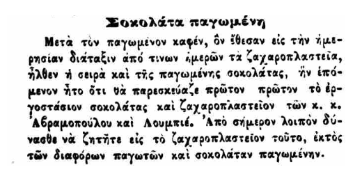 Η διαφήμιση της εφημερίδας «Αθηναϊκή», στις 19 Απρίλιου 1890, μας αποκαλύπτει ότι οι Αθηναίοι είχαν αρχίσει να απολαμβάνουν παγωμένο καφέ και μάλιστα με την προσθήκη γάλακτος, όπως και παγωμένη σοκολάτα που το ίδιο διάστημα κατασκεύασε το εργαστήριο-ζαχαροπλαστείο των κυρίων Αβραμόπουλου και Λουμπιέ.
