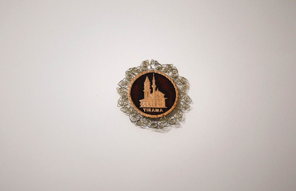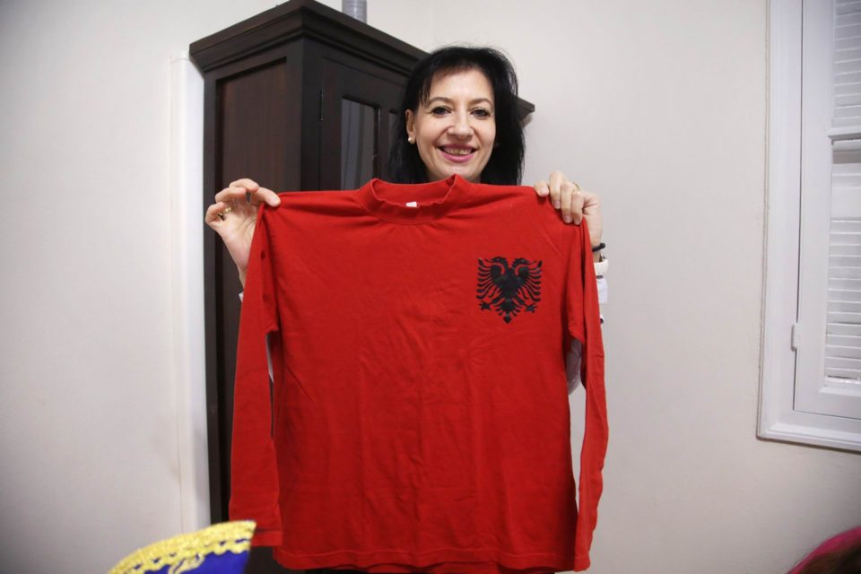 Η δασκάλα Άλμα Ζεκολλάρι κρατώντας μια μπλούζα με τον δικέφαλο αετό της αλβανικής σημαίας.