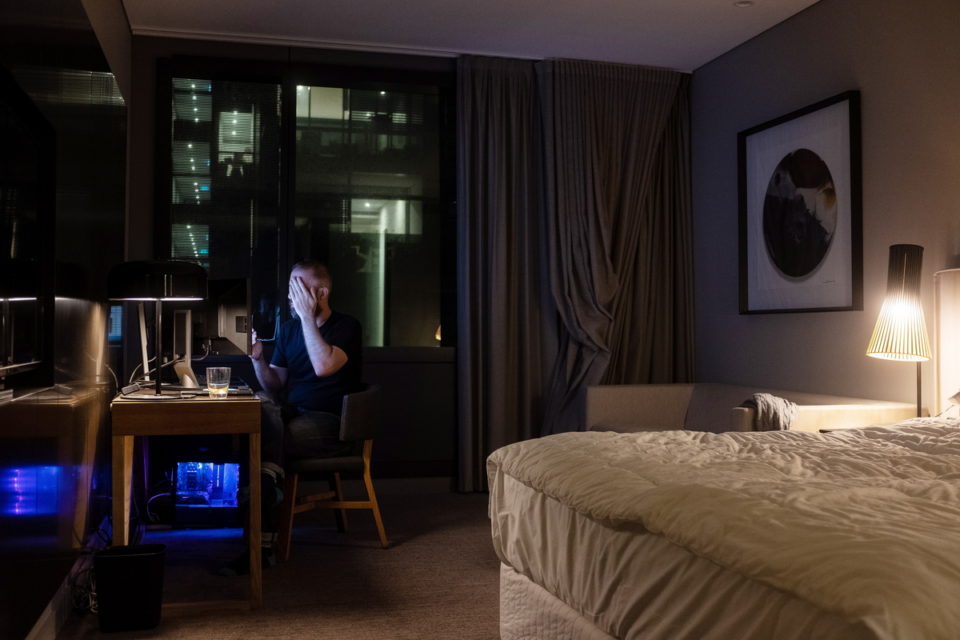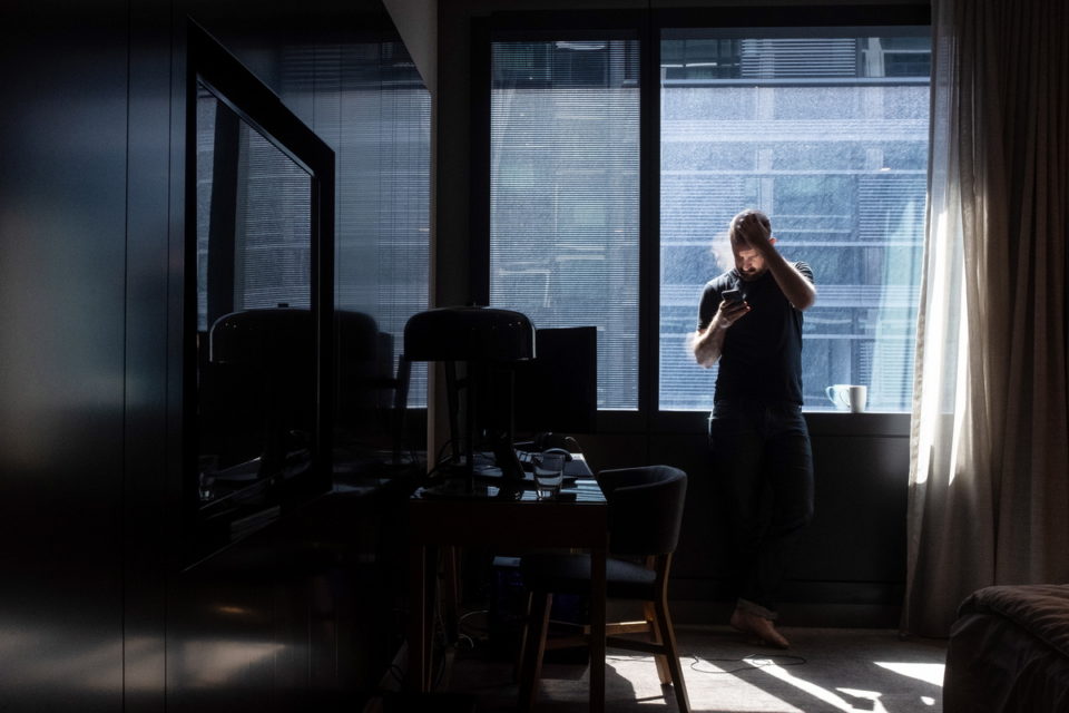 Διαβάζοντας ένα μυθιστόρημα στο τάμπλετ. Το άτομο στο δωμάτιο, που επέστρεψε από ταξίδι στο εξωτερικό, βρίσκεται σε υποχρεωτική καραντίνα δύο εβδομάδων σε ξενοδοχείο στο Σίδνεϊ της Αυστραλίας, 5 Νοεμβρίου 2020.