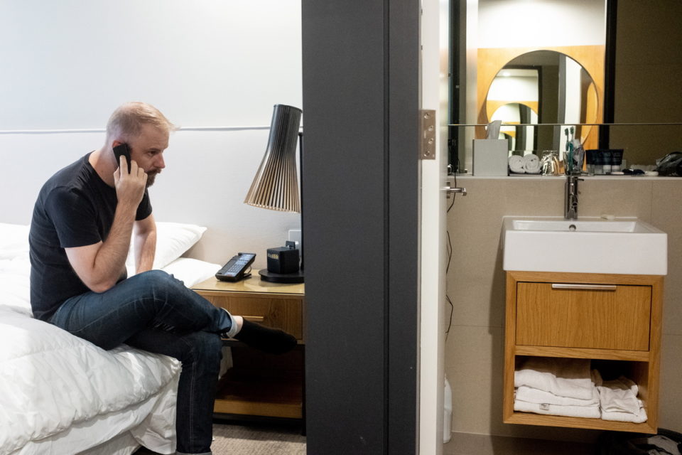 Ένα μέλος του προσωπικού του ξενοδοχείου χτυπά την πόρτα στο δωμάτιο, για να παραδόσει το δείπνο. 6 Νοεμβρίου 2020.