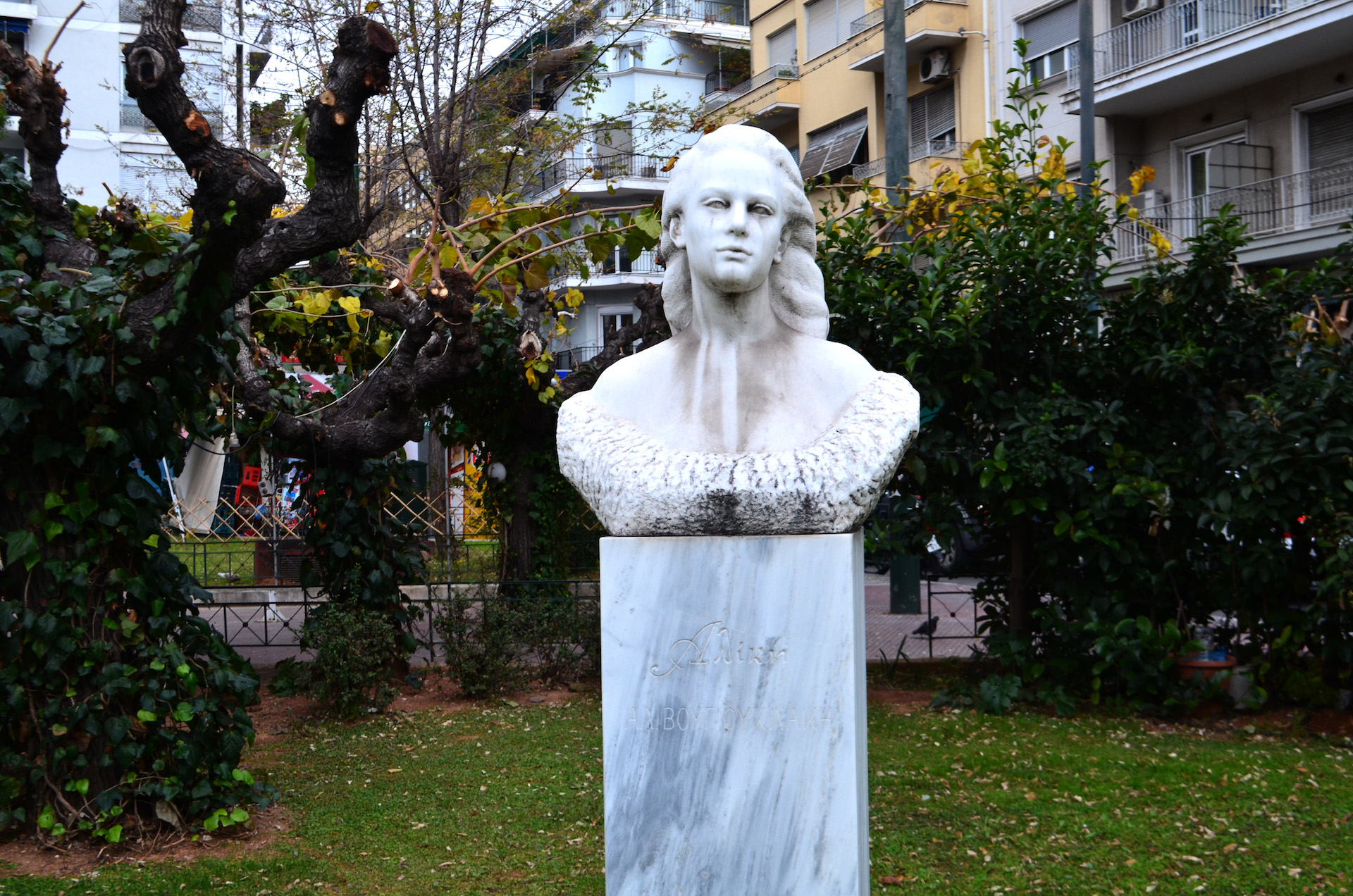 Τα αποκαλυπτήρια της προτομής της Αλίκης Βουγιουκλάκη τον Μάιο του 2000 φανερώνουν μια φυσιογνωμία που σε τίποτα δεν θυμίζει την «Εθνική Σταρ». Δεν υπάρχει αναφορά του ονόματος της παρά μόνο του ιδρύματος «Φώτος Φωτιάδης» που υπήρξε ο χορηγός. Κατά τη διάρκεια της νύχτας η προτομή (αλλά και το βάθρο) αφαιρείται από αγνώστους και στη θέση τους μπαίνει μια σιδερώστρα. Τελικά, το 2004 δεύτερη προτομή της Βουγιουκλάκη, τοποθετείται στο ίδιο σημείο όπου παραμένει μέχρι σήμερα. Στο βάθρο της υπάρχει η λιτή επιγραφή «ΑΛΙΚΗ».