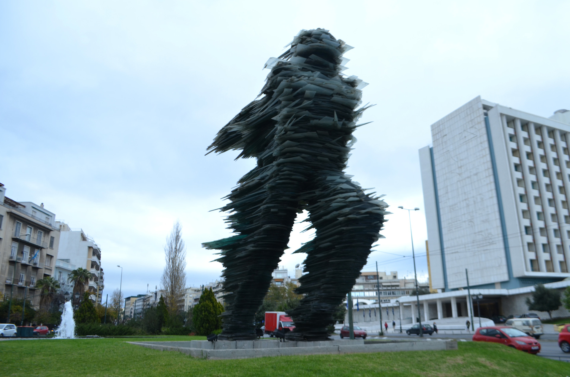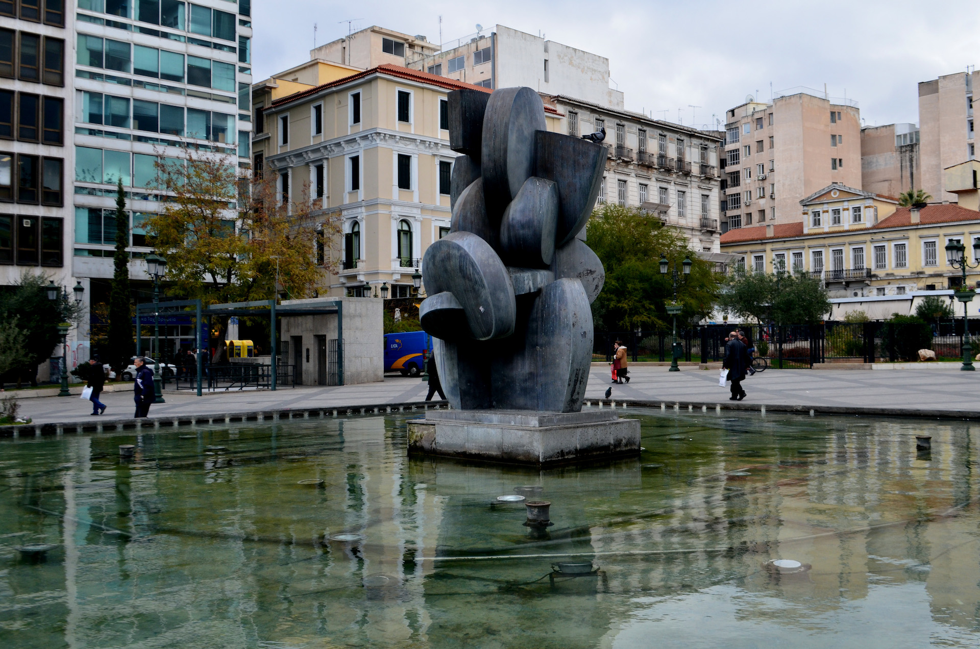 Το πιο ταλαίπωρο από τα έργα της λίστας. Δεν ξεσήκωσε μίση και πάθη, παρ’ όλα αυτά δεν λειτουργεί όπως το οραματίστηκε ο δημιουργός του. Το γλυπτό βρίσκεται ανατολικά της πλατείας μεταξύ των οδών Πανεπιστημίου και Σταδίου μέσα σε ειδικά διαμορφωμένη δεξαμενή νερού, έχει ύψος 15 μέτρα, είναι κατασκευασμένο από ανοξείδωτο ατσάλι και αποτελείται από σταυροειδή κατασκευή με πέντε κύκλους οι οποίοι κινούνται με τη βοήθεια του νερού. Κινούνται όμως τελικά; Όχι. Η υδροκινητική λειτουργία του γλυπτού επί σειρά ετών παρέμενε ημιτελής, καθώς είχε διακοπεί η παροχή νερού. Εξαίρεση αποτελεί ένα σύντομο χρονικό διάστημα -τέλη 2008 με αρχές 2009-, κατά το οποίο το έργο συντηρήθηκε σε συνεργασία με τον Δήμο Αθηναίων και λειτούργησε υδροκινητικά, όπως το είχε σχεδιάσει ο Ζογγόπουλος.