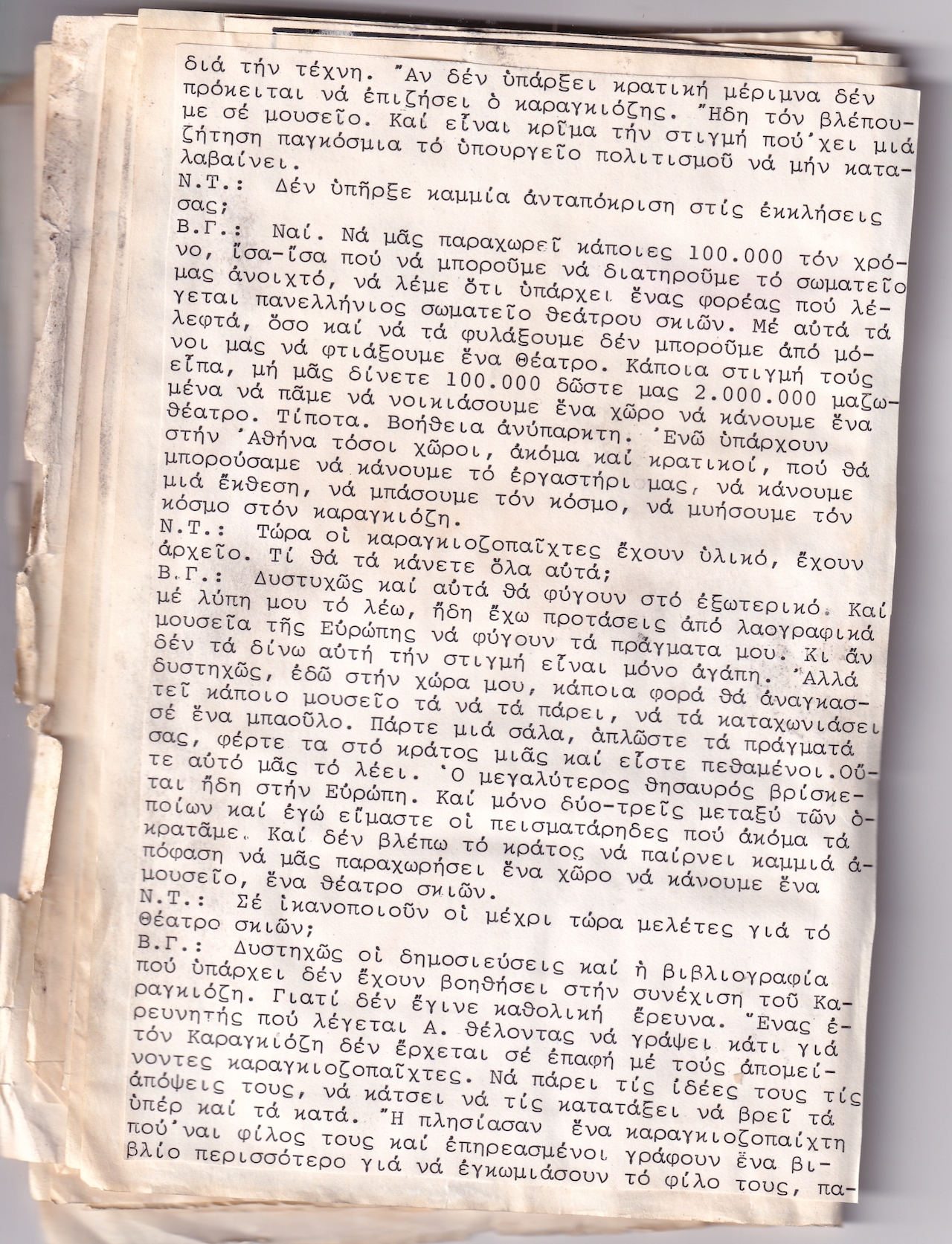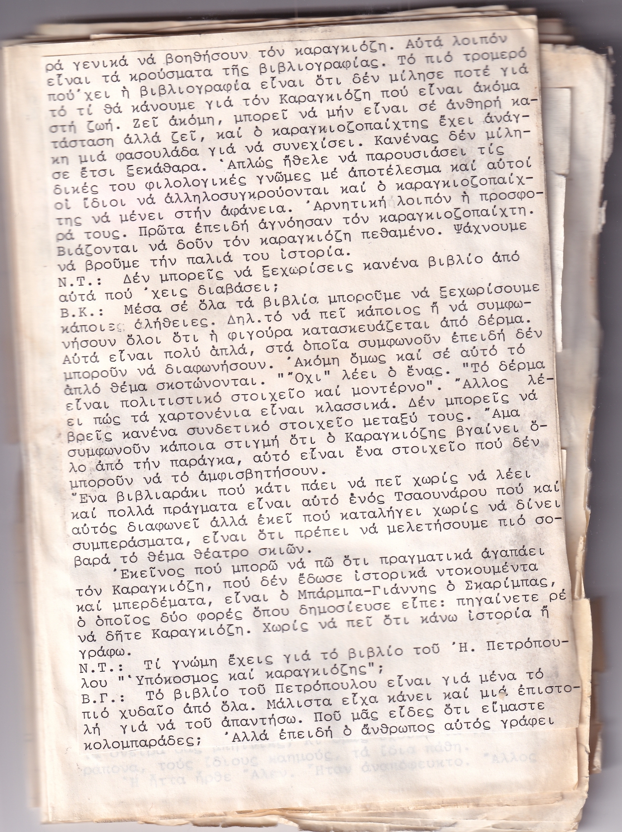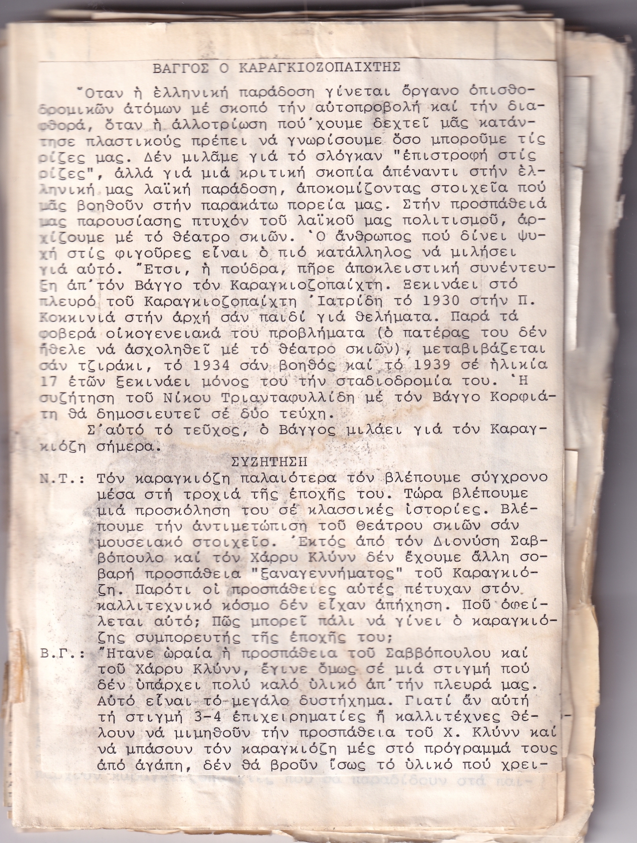 Με αυτή την εισαγωγή: «Όταν η ελληνική παράδοση γίνεται όργανο οπισθοδρομικών ατόμων, με σκοπό την αυτοπροβολή και τη διαφθορά, όταν η αλλοτρίωση που ‘χουμε δεχθεί μας κατάντησε πλαστικούς, πρέπει να γνωρίσουμε όσο μπορούμε τις ρίζες μας. Δε μιλάμε για το σλόγκαν “επιστροφή στις ρίζες” αλλά για μια κριτική σκοπιά απέναντι στην ελληνική μας λαϊκή παράδοση, αποκομίζοντας στοιχεία που μας βοηθούν στην παρακάτω πορεία μας. Στην προσπάθεια μιας παρουσίασης πτυχών του λαϊκού μας πολιτισμού, αρχίζουμε με το θέατρο σκιών. Ο άνθρωπος που δίνει ψυχή στις φιγούρες είναι ο πιο κατάλληλος να μιλήσει για αυτό. Έτσι, η Πούδρα πήρε αποκλειστική συνέντευξη από τον Βάγγο τον Καραγκιοζοπαίχτη. Ξεκινάει στο πλευρό του καραγκιοζοπαίχτη Ιατρίδη το 1930 στην Π.Κοκκινιά στην αρχή σαν παιδί για θελήματα. Παρά τα φοβερά οικογενειακά του προβλήματα (ο πατέρας του δεν ήθελε να ασχοληθεί με το θέατρο σκιών) μεταβιβάζεται σαν τζιράκι, το 1934 σαν βοηθός και το 1939 σε ηλικία 17 ετών ξεκινάει μόνος του τη σταδιοδρομία του.»