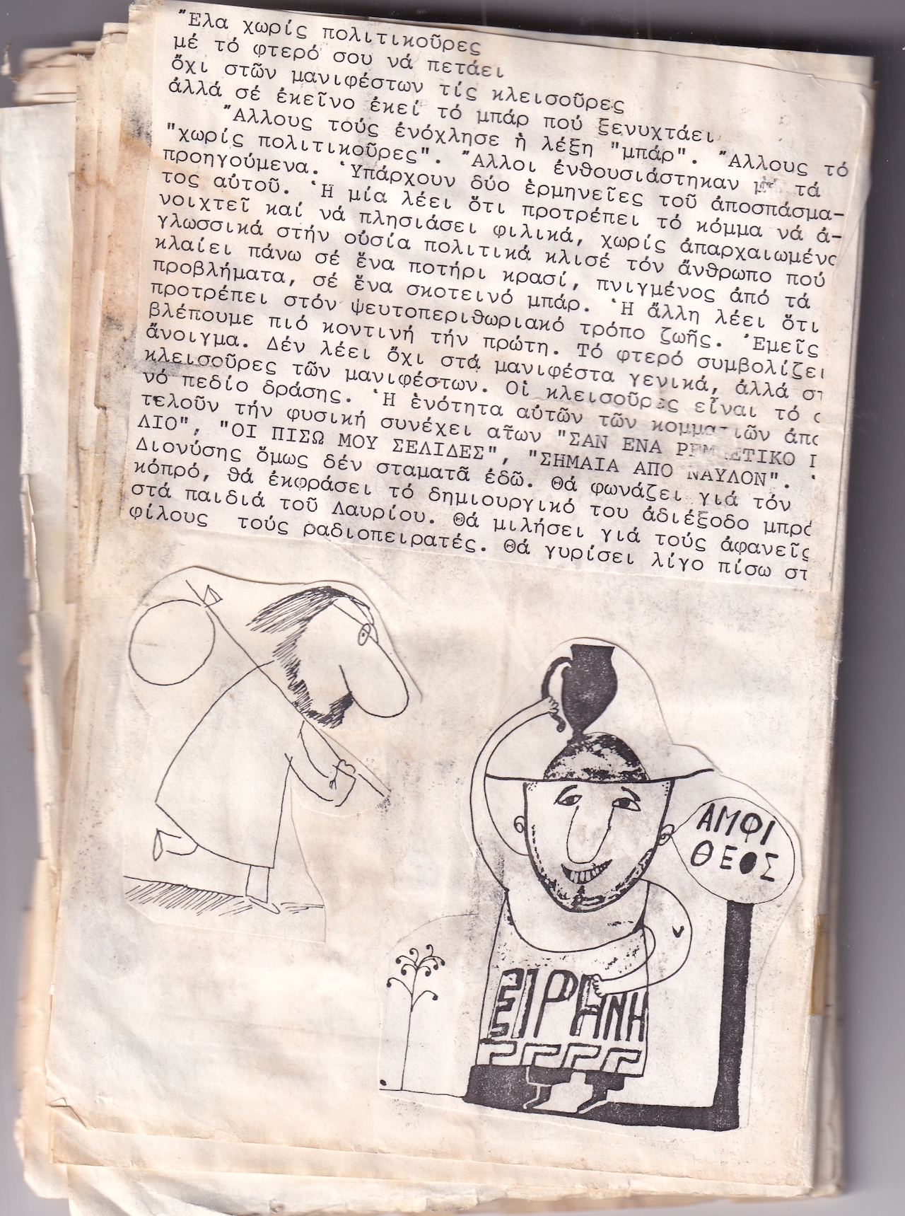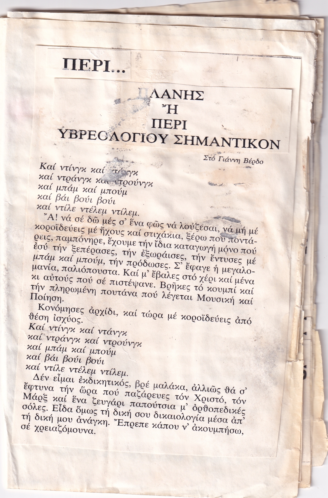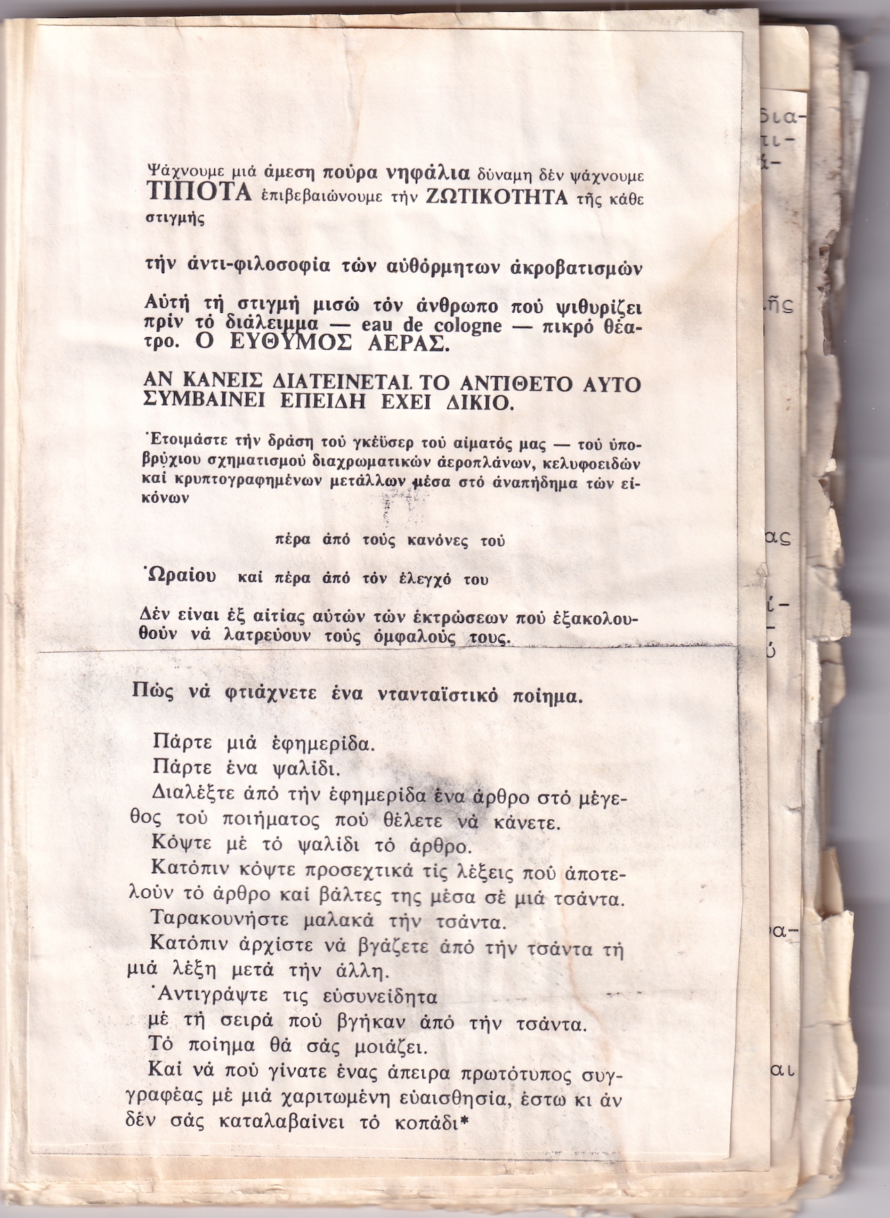 Φανταστικές συνεντεύξεις με τους πολιτικούς αρχηγούς της εποχής, ένα γράμμα στον Άλεν Γκίνσμπεργκ, κόμικ, αντι-ανθολογία ελληνικών τραγουδιών, μανιφέστα του ντανταϊσμού, είναι μόνο μερικά ακόμη από τα θέματα που θα διαβάσετε στις ψηφιοποιημένες σελίδες που ακολουθούν.