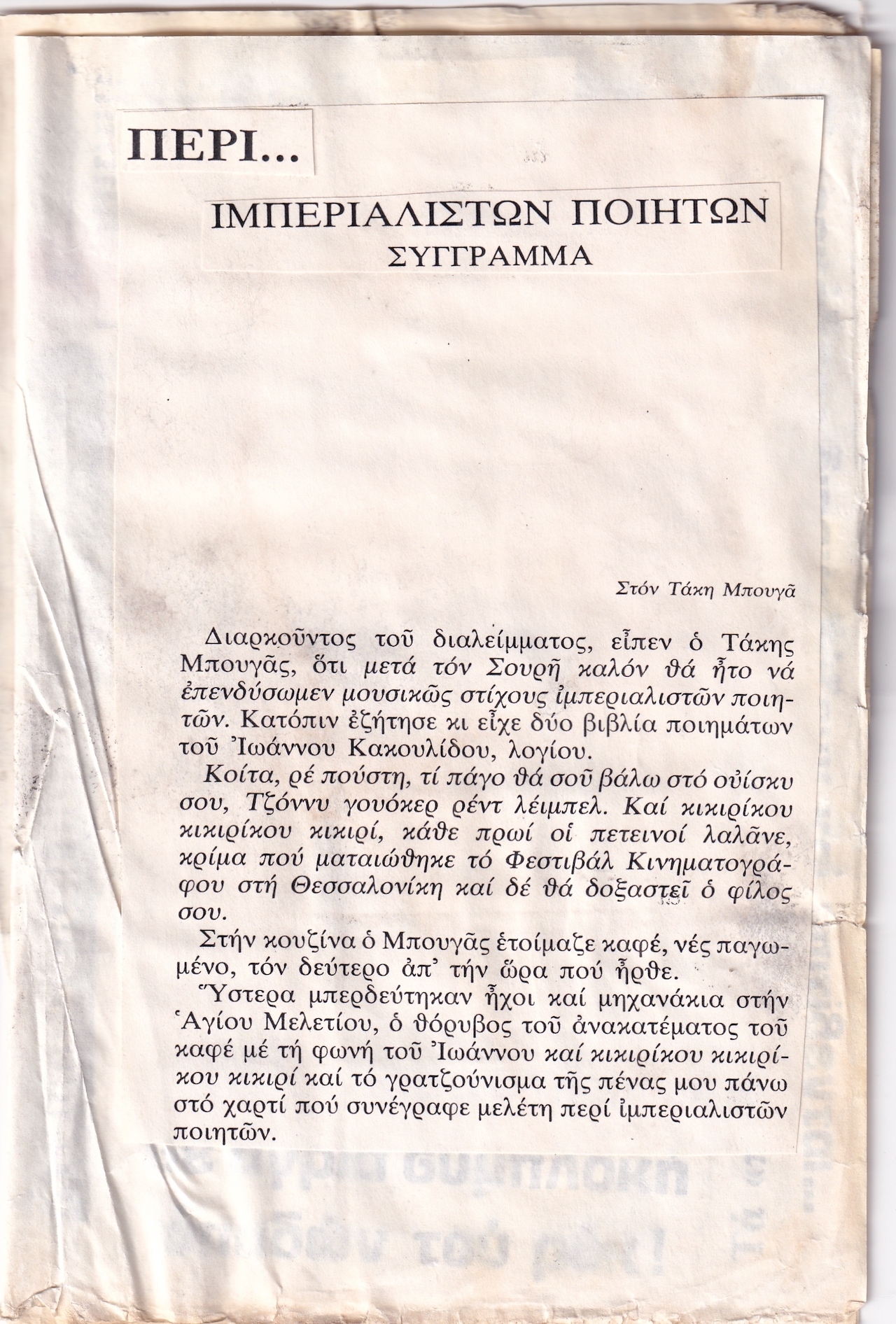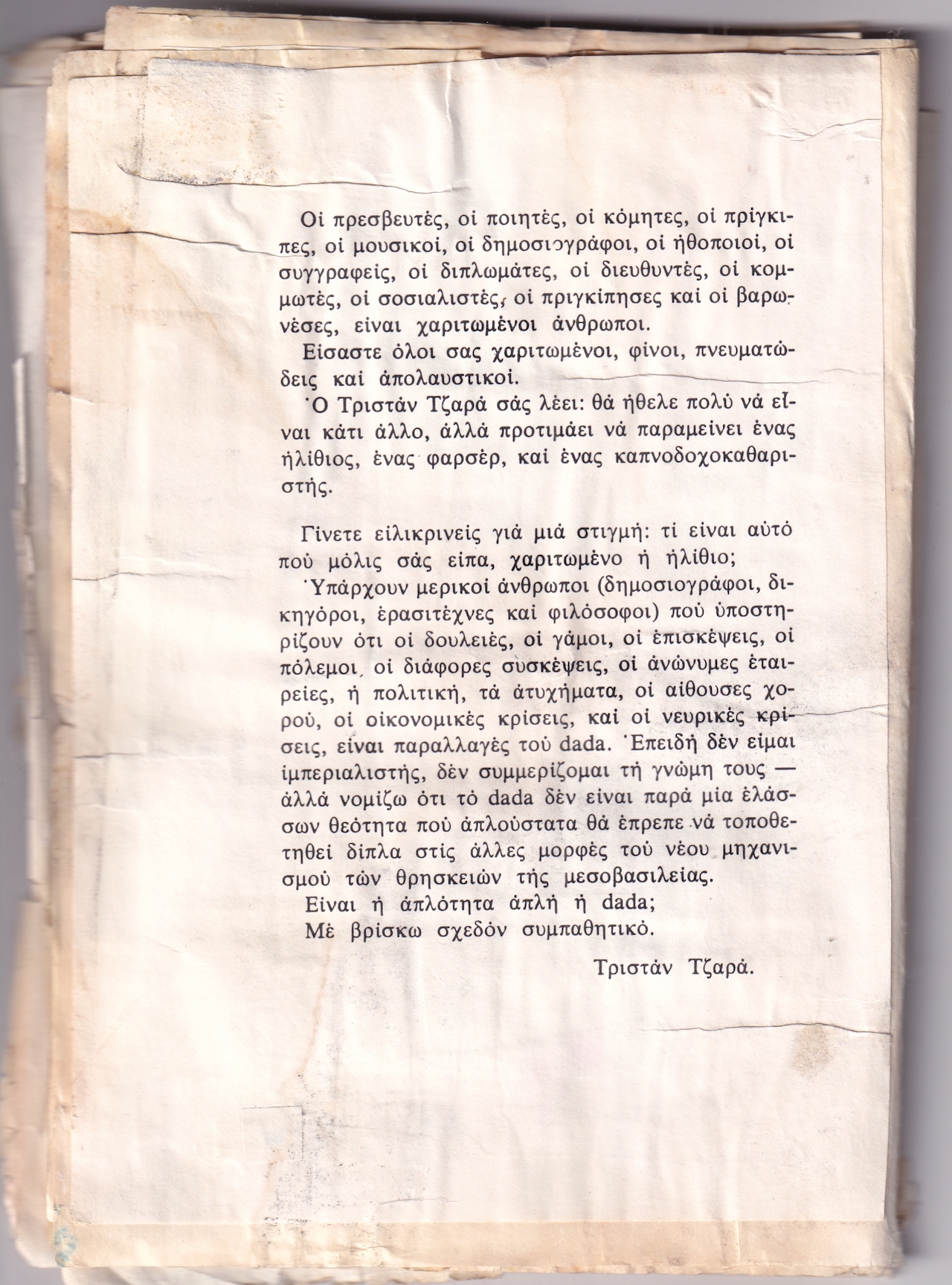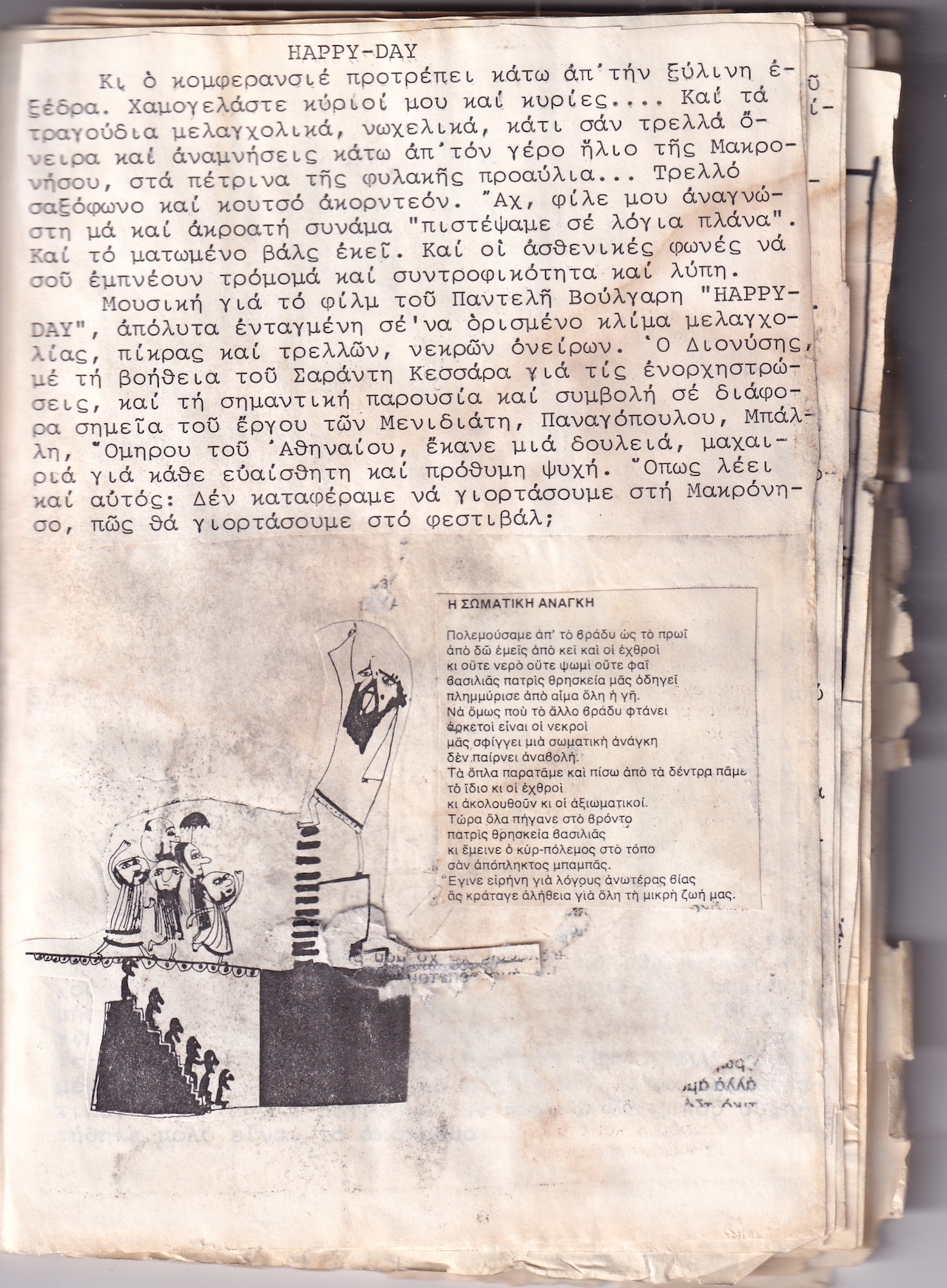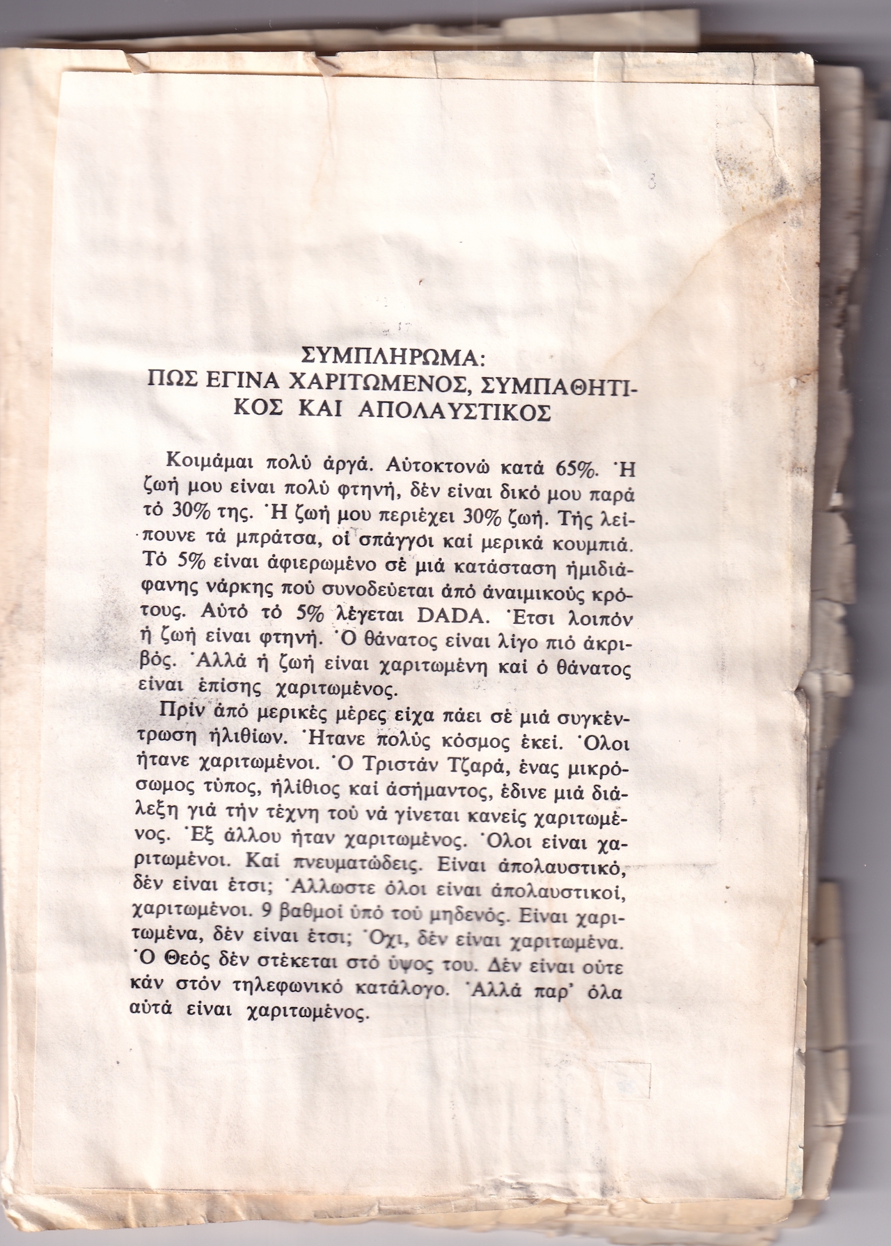 Φανταστικές συνεντεύξεις με τους πολιτικούς αρχηγούς της εποχής, ένα γράμμα στον Άλεν Γκίνσμπεργκ, κόμικ, αντι-ανθολογία ελληνικών τραγουδιών, μανιφέστα του ντανταϊσμού, είναι μόνο μερικά ακόμη από τα θέματα που θα διαβάσετε στις ψηφιοποιημένες σελίδες που ακολουθούν.