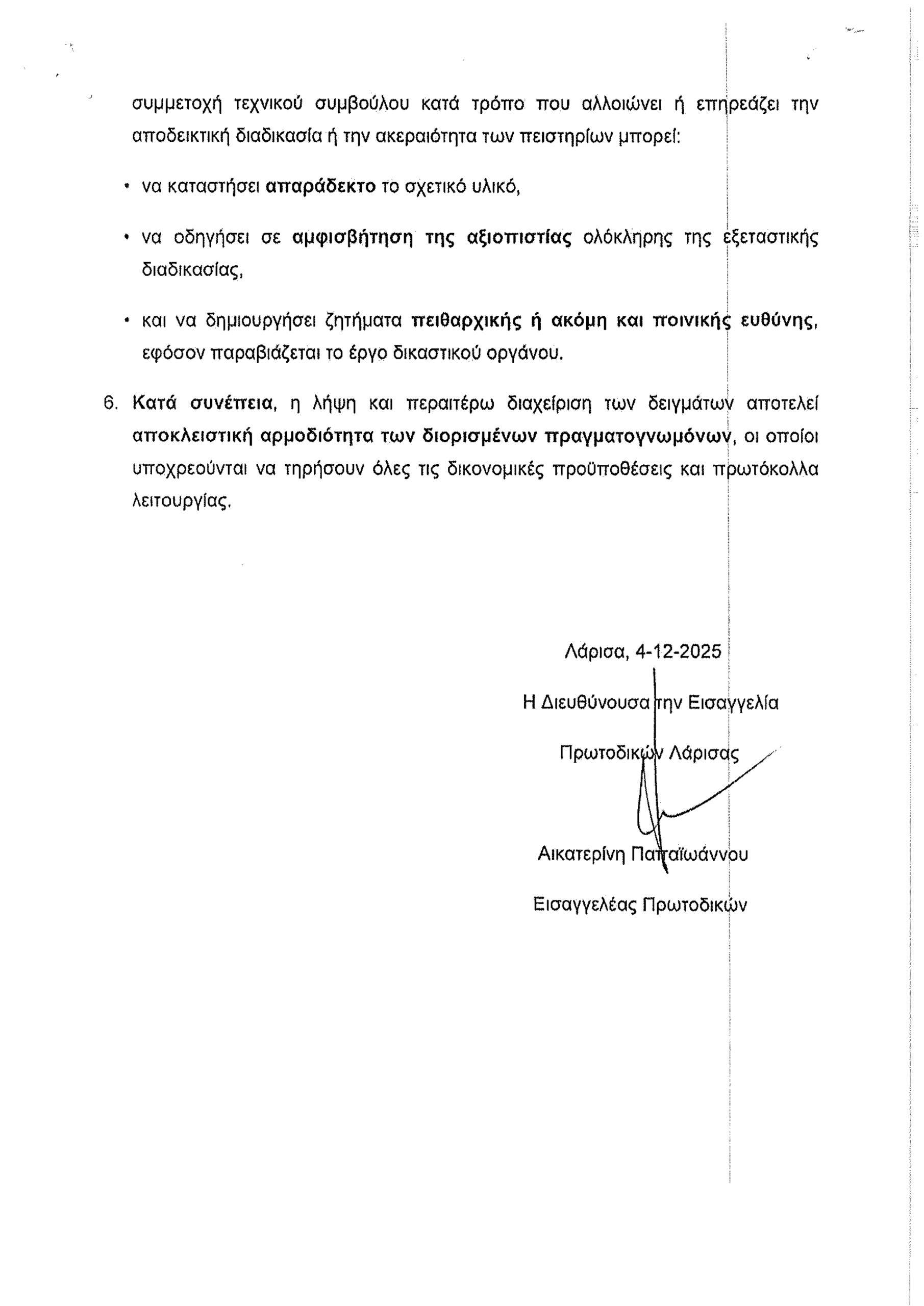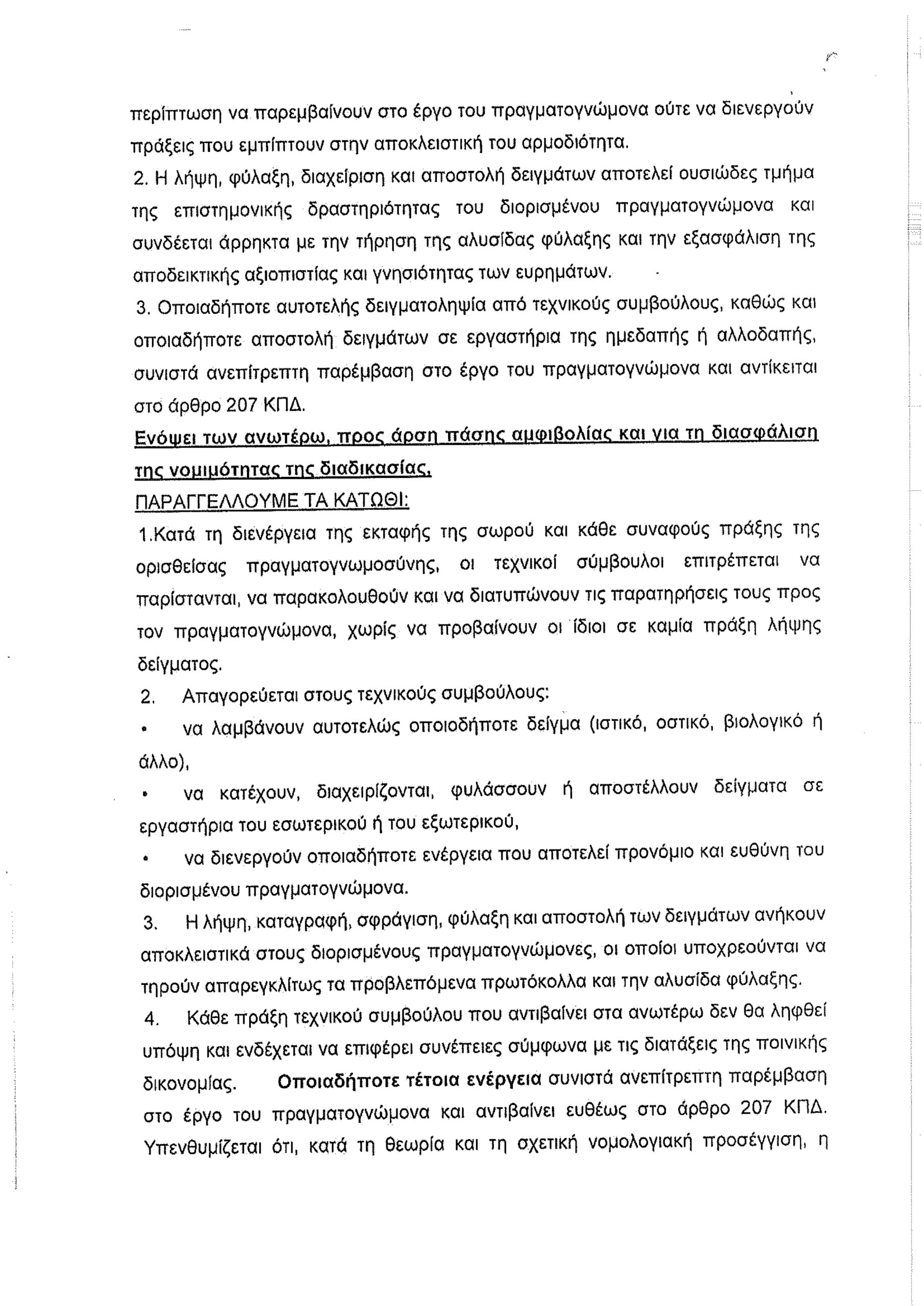 Κατά συνέπεια, η λήψη και περαιτέρω διαχείριση των δειγμάτων αποτελεί αποκλειστική αρμοδιότητα των διορισμένων πραγματογνωμόνων, οι οποίοι υποχρεούνται να τηρήσουν όλες τις δικονομικές προϋποθέσεις και πρωτόκολλα λειτουργίας».