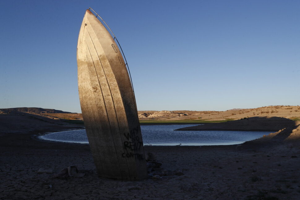 Ενα παλιότερα βυθισμένο σκάφος, που τώρα πια  εμφανίζεται σε όρθια θέση κατά μήκος της ακτής της λίμνης Mead στην εθνικό πάρκο Lake Mead National Recreation Area στο Boulder City, Νεβάδα, ΗΠΑ, 1 Ιουλίου 2022. H λίμνη Mead είναι ένας ταμιευτήρας νερού που σχματίζεται από το φράγμα Hoover και βρίσκεται ανάμεσα στις πολιτείες της Νεβάδα και της Αριζόνα. Μέχρι το τέλος του 2025, υπολογίστηκε ότι θα έχει χάσει περίπου το 60% του νερού της. EPA/CAROLINE BREHMAN