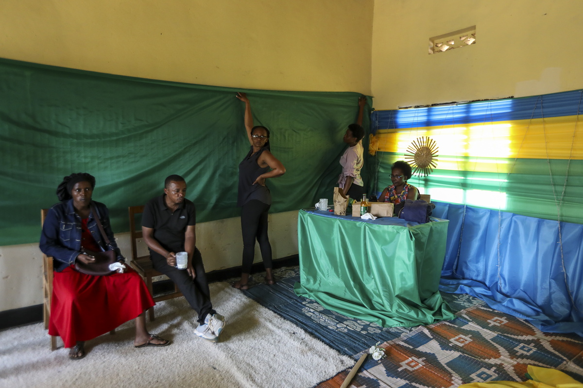 Εθελοντές της Ρουάντα στολίζουν ένα εκλογικό τμήμα με τα χρώματα της εθνικής σημαίας,πριν από την ημέρα των εκλογών στο Κιγκάλι της Ρουάντα, 14 Ιουλίου 2024. EPA/DANIEL IRUNGU