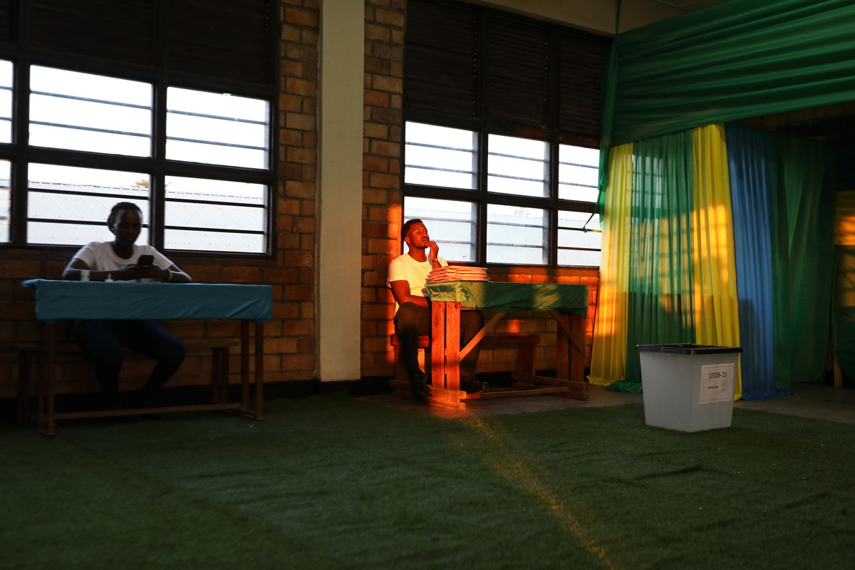 Εκλογικοί υπάλληλοι κάθονται σε ένα εκλογικό κέντρο στο Κιγκάλι της Ρουάντα, 15 Ιουλίου 2024. EPA/DANIEL IRUNGU