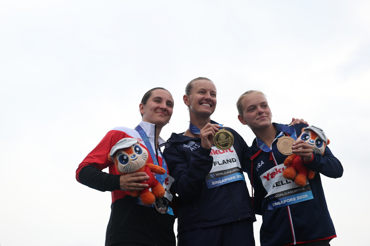 Από αριστερά προς τα δεξιά: Η κάτοχος του ασημένιου μεταλλίου, Simone Leathead από τον Καναδά, η χρυσή παγκόσμια πρωταθλήτρια για το 2025, Rhiannan Iffland από την Αυστραλία και η Maya Kelly από τις ΗΠΑ, κάτοχος του χάλκινου μεταλλίου, κατά τη διάρκεια της τελετής απονομής των μεταλλίων στον τελικό του αγωνίσματος 20μ. υψηλής κατάδυσης γυναικών, στο Παγκόσμιο Πρωτάθλημα Υγρού Στίβου Σιγκαπούρη, 26 Ιουλίου 2025. EPA/FAZRY ISMAIL