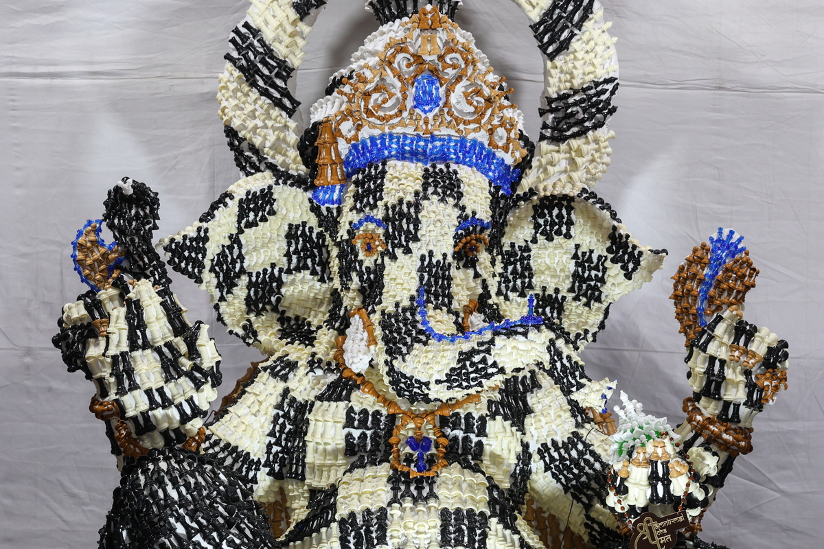 Ένα είδωλο της ινδουιστικής θεότητας Ganesha με το χαρακτηριστικό κεφάλι ελέφαντα, ύψους τριών μέτρων και φτιαγμένο από 9.999 πιόνια σκακιού παρουσιάζεται κατά τη διάρκεια του φεστιβάλ Ganpati στη Βομβάη της Ινδίας, 13 Σεπτεμβρίου 2024. Το είδωλο προορίζεται για το φεστιβάλ Ganesha Chaturthi, ένα δεκαήμερο εκδήλωση που γιορτάζεται σε όλη την Ινδία. EPA/DIVYAKANT SOLANKI