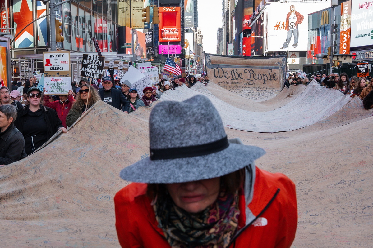 Άνθρωποι κρατούν ένα πανό με αντίγραφο του Συντάγματος των ΗΠΑ. «No Kings» στη Νέα Υόρκη, στις 28 Μαρτίου 2026. EPA/Olga Fedorova