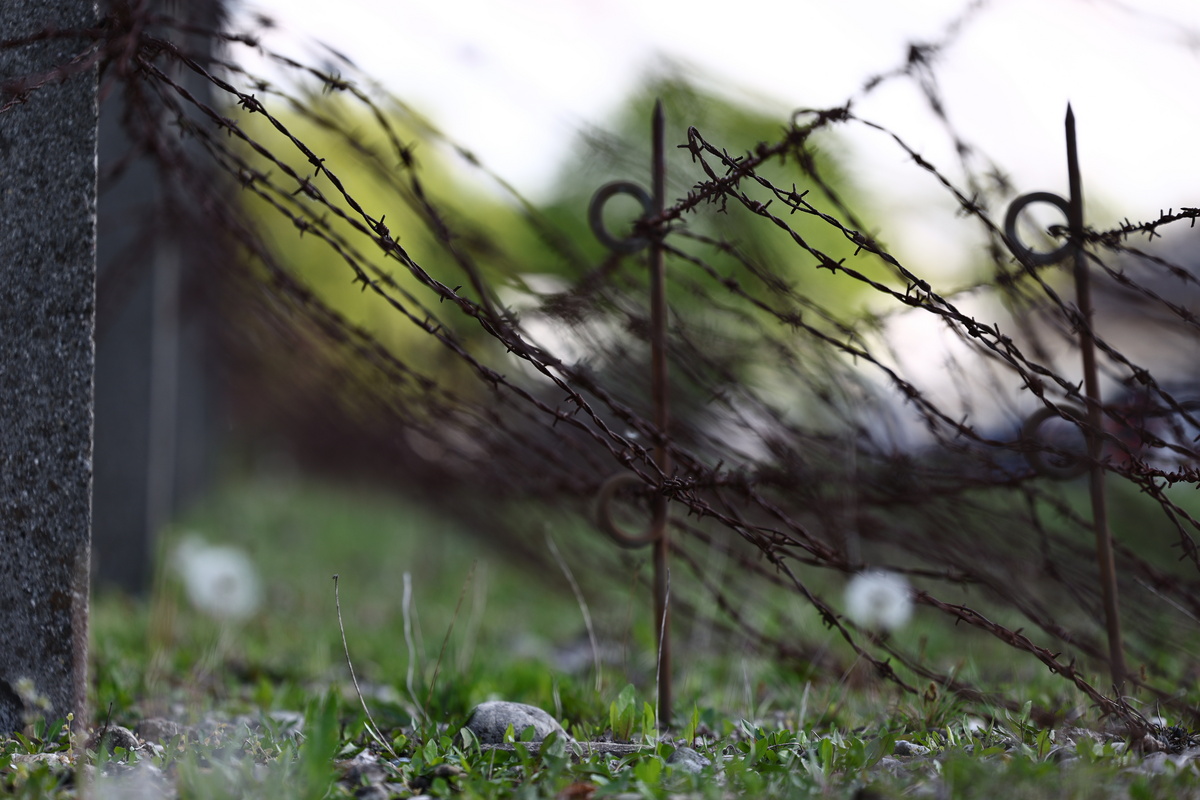 Μέρος από το συρματόπλεγμα, με το οποίο ήταν σπαρμένος όλος ο περίβολος χώρος έξω από το στρατόπεδο σε βάθος εκατοντάδων μέτρων, ώστε όποιος κατάφερνε να δραπετεύσει να πεθαίνει ακαριαία από τον ηλεκτρισμό που το διάτρεχε. Στο χώρο μνήμης του στρατοπέδου συγκέντρωσης Νταχάου, κατά την εκδήλωση μνήμης στο πρώην στρατόπεδο για την 80ή επέτειο της απελευθέρωσής του, στο Νταχάου της Γερμανίας, 29 Απριλίου 2025. EPA/ANNA SZILAGYI