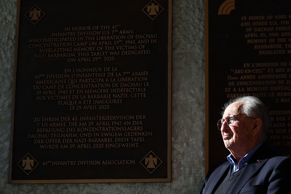 Ο επιζών του Ολοκαυτώματος Abba Nasr στέκεται στη νεοαποκαλυφθείσα αναμνηστική πλάκα αφιερωμένη στη μνήμη των στρατιωτών της 45ης Μεραρχίας, κατά τη διάρκεια εκδήλωσης μνήμης στο πρώην στρατόπεδο συγκέντρωσης Νταχάου για την 80ή επέτειο της απελευθέρωσής του από την Μεραρχία των αμερικανιικών δυνάμεων. Νταχάου της Γερμανίας, 29 Απριλίου 2025. EPA/ANNA SZILAGYI