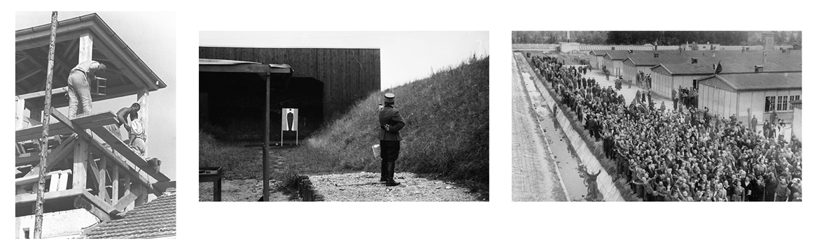 Φωτογραφίες από τα χρόνια λειτουργίας του στρατοπέδου συγκέντρωσης Νταχάου. Αριστερά: Κρατούμενοι αναγκάστηκαν να χτίσουν τον πύργο φρουράς στο Jourhaus, φωτογραφία προπαγάνδας των SS, στρατόπεδο συγκέντρωσης Νταχάου, Γερμανία, 1937. Κέντρο: εξάσκηση σκοποβολής από αξιωματικό των SS στο Hebertshausen, όπου είχε μεταφερθεί ο χώρος εκτέλεσης των Σοβιετικών αιχμαλώτων πολέμου. Νταχάου, Γερμανία, 1941. Δεξιά: οι κρατούμενοι του Νταχάου χαιρετούν τους απελευθερωτές τους. Στρατόπεδο συγκέντρωσης Νταχάου, Γερμανία, Μάιος 1945.