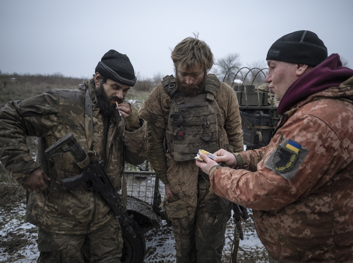 Στρατιώτες της 93ης Μηχανοκίνητης Ταξιαρχίας προσφέρουν τσιγάρα στους συντρόφους τους Denis, με κωδικό «Bars», και Dmytro, με κωδικό «K2», κατά την επιστροφή τους από τις θέσεις τους κοντά στο Kostyantynivka, όπου πολέμησαν για 130 συνεχόμενες ημέρες, στην περιοχή του Ντονέτσκ, Ουκρανία, στις 16 Δεκεμβρίου 2025. EPA/Υπηρεσία Τύπου της 93ης Μεμονωμένης Μηχανοκίνητης Ταξιαρχίας Kholodnyi Yar των Ουκρανικών Ένοπλων Δυνάμεων.