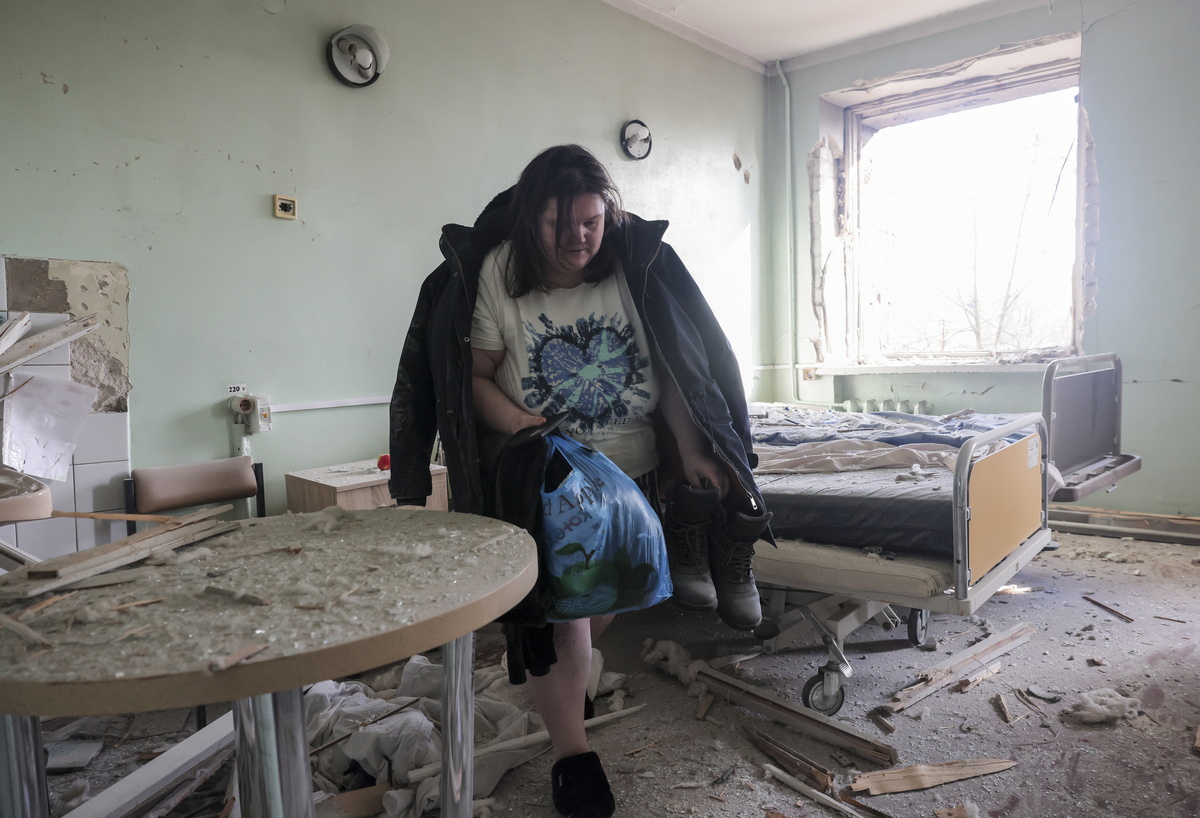 Μια γυναίκα μαζεύει τα πράγματά της από έναν κατεστραμμένο θάλαμο μαιευτηρίου μετά από ρωσική επίθεση στη Ζαπορίζια, στη νοτιοανατολική Ουκρανία, την 1η Φεβρουαρίου 2026, εν μέσω της ρωσικής εισβολής. EPA/OLEG MOVCHANIUK