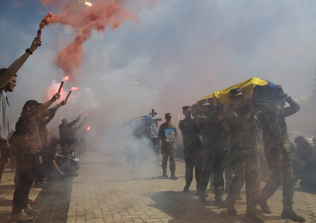 Ουκρανοί ανάβουν φωτοβολίδες κατά τη διάρκεια τελετής αποχαιρετισμού τριών νεκρών Ουκρανών στρατιωτών 30, 27 και 24 ετών, στο Κίεβο της Ουκρανίας, στις 4 Ιουνίου 2025. EPA/SERGEY DOLZHENKO