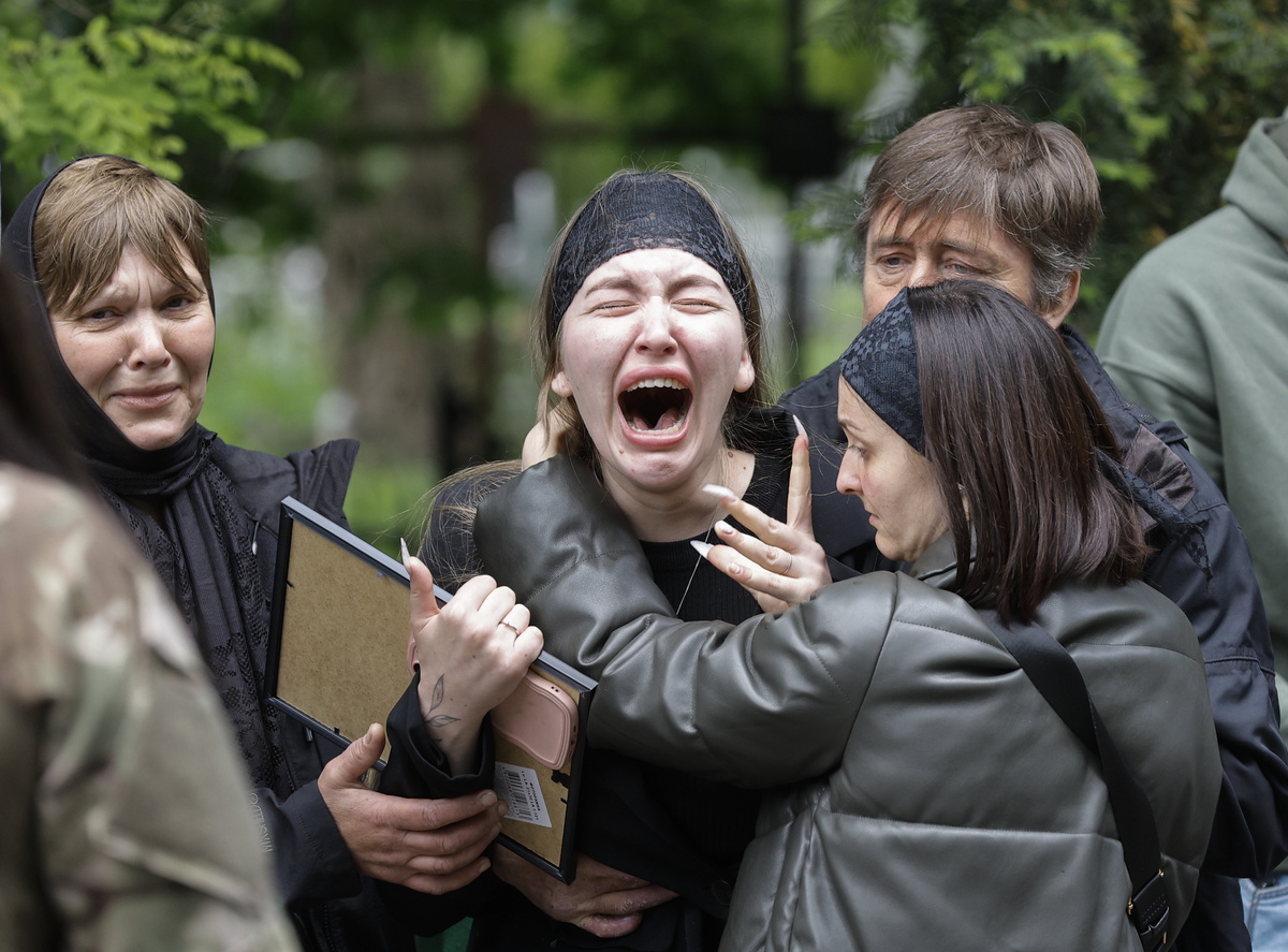 Συγγενείς, φίλοι και σύντροφοι, φορτισμένοι συναισθηματικά, παρευρίσκονται στην κηδεία του εκλιπόντος Ουκρανού στρατιώτη Αντρέι Λεβάσοφ, στο Κίεβο της Ουκρανίας, στις 7 Μαΐου 2024. EPA/SERGEY DOLZHENKO