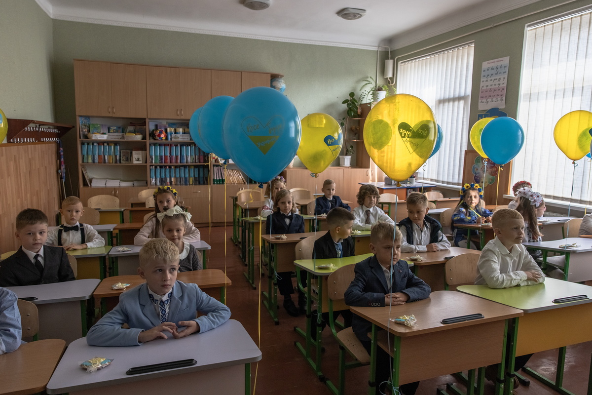 Μπαλόνια με τα εθνικά χρώματα της Ουκρανίας στέκονται στον αέρα δίπλα στα θρανία, καθώς μαθητές της πρώτης τάξης βρίσκονται στην αίθουσα για την πρώτη μέρα του νέου σχολικού έτους, γνωστή ως «Ημέρα της Γνώσης», στη Μπούχα της Ουκρανίας, 1 Σεπτεμβρίου 2022. EPA/ROMAN PILIPEY