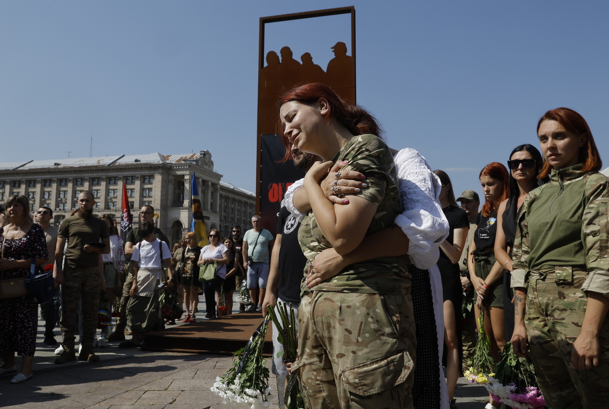 Συγγενείς, φίλοι και σύντροφοι της νεκρής Ουκρανής στρατιώτισσας Ναταλία Κουζνέτσοβα, με το παρατσούκλι «Ιράνκα», ξεσπούν σε κλάμματα, καθώς παρευρίσκονται στην τελετή αποχαιρετισμού στην Πλατεία Ανεξαρτησίας στο Κίεβο της Ουκρανίας, στις 29 Αυγούστου 2024. EPA/SERGEY DOLZHENKO
