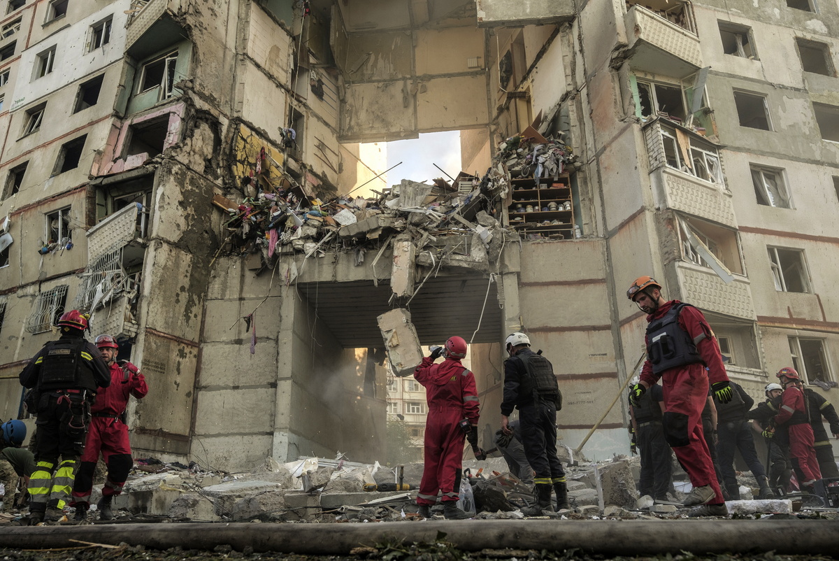 Ουκρανοί διασώστες επιχειρούν στον τόπο ρωσικής επίθεσης, σε πολυώροφο κτίριο κατοικιών στο Χάρκοβο, βορειοανατολική Ουκρανία, 24 Σεπτεμβρίου 2024. EPA/GEORGE IVANCHENKO