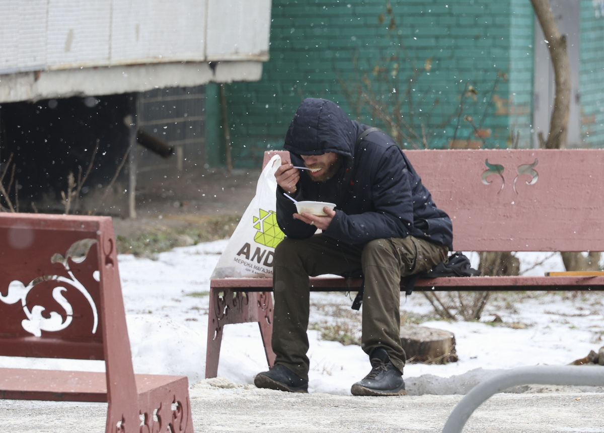 Αντρας κάθεται σε ένα παγκάκι και τρώει ζεστό φαγητό που εθελοντές μοιράζουν στους κατοίκους του Χαρκόβου που δεν μπορούν να μαγειρέψουν στο σπίτι τους λόγω των συνεχών διακοπών ρεύματος και των παγωμένων θερμοκρασιών. Χάρκοβο, βορειοανατολική Ουκρανία, 17 Φεβρουαρίου 2026. EPA/SERGEY KOZLOV
