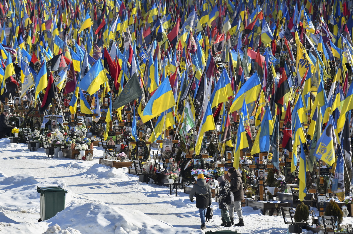 Άνθρωποι επισκέπτονται τους τάφους Ουκρανών στρατιωτών που σκοτώθηκαν στον πόλεμο με τη Ρωσία στο νεκροταφείο Lychakiv στο Λβιβ της Δυτικής Ουκρανίας, στις 21 Φεβρουαρίου 2026, εν μέσω της συνεχιζόμενης ρωσικής εισβολής. EPA/MYKOLA TYS