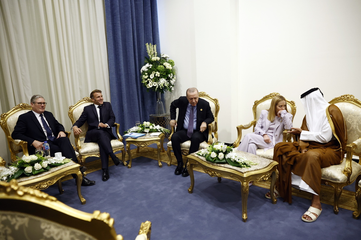 (Από αριστερά προς τα δεξιά) Ο Βρετανός πρωθυπουργός Κιρ Στάρμερ, ο Γάλλος πρόεδρος Εμανουέλ Μακρόν, ο Τούρκος πρόεδρος Ταγίπ Ερντογάν, η Ιταλίδα πρωθυπουργός Τζιόρτζια Μελόνι και ο Εμίρης του Κατάρ Σέιχ Αλ-Θάνι, συμμετέχουν σε συνάντηση στο Διεθνές Συνέδριο Ειρήνης της Γάζας στο Σαρμ Ελ Σέιχ της Αιγύπτου, στις 13 Οκτωβρίου 2025. EPA/YOAN VALAT /POOL