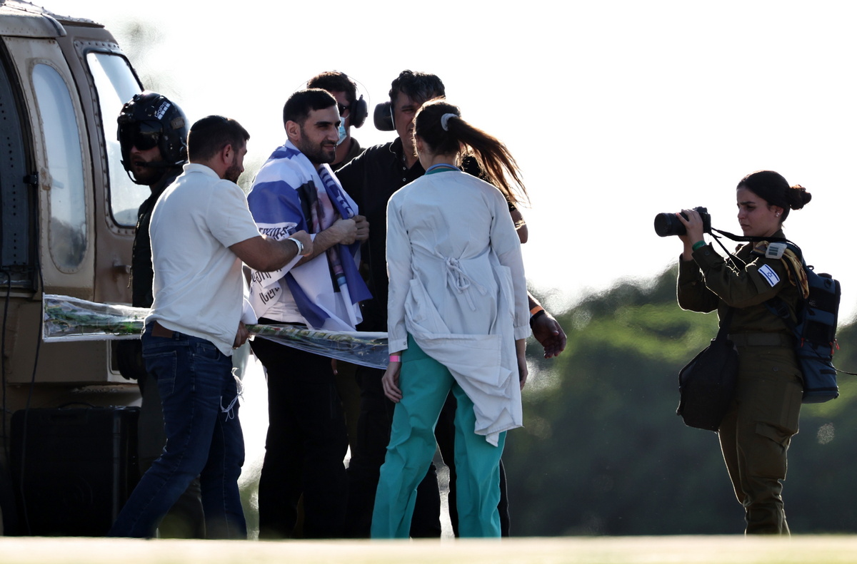 Ο απελευθερωμένος Ισραηλινός όμηρος Segev Kalfon αποβιβάζεται από στρατιωτικό ελικόπτερο κατά την άφιξή του στο νοσοκομείο Sheba στο Ramat Gan, κοντά στο Τελ Αβίβ, Ισραήλ, 13 Οκτωβρίου 2025. Πρώτη φάση της ειρηνευτικής συμφωνίας για τη Γάζα. EPA/ATEF SAFADI