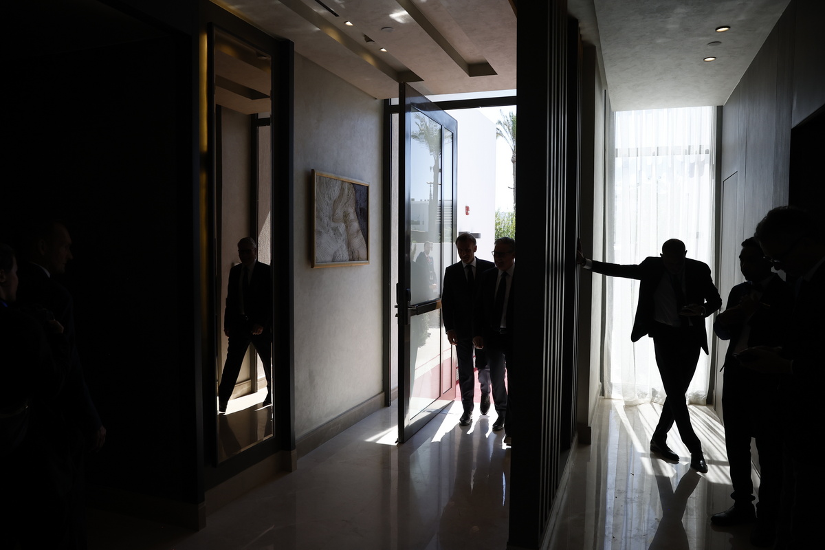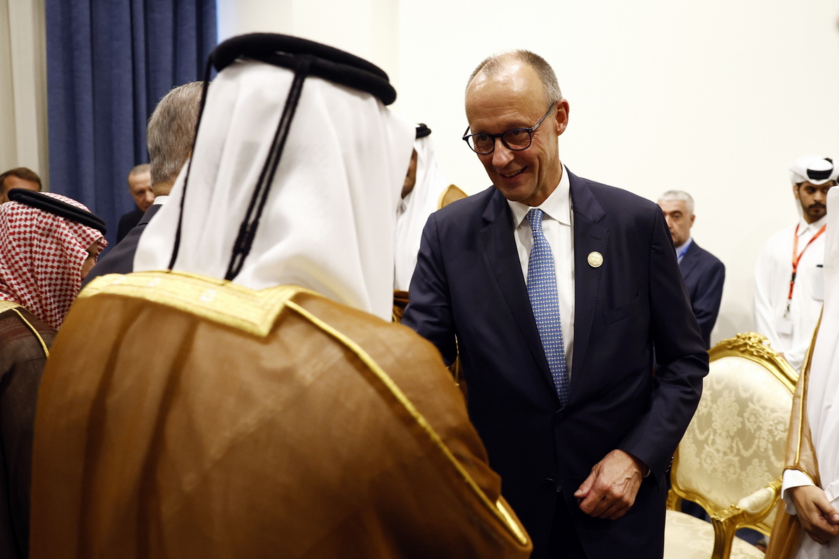 Ο Γερμανός καγκελάριος Φρίντριχ Μερτς παρευρίσκεται σε διμερή συνάντηση με τον Εμίρη του Κατάρ Σέιχ Ταμίν μπεν Χάμαντ αλ-Θάνι, στη Διεθνή Σύνοδο Κορυφής για την Ειρήνη στη Γάζα στο Σαρμ Ελ Σέιχ της Αιγύπτου, στις 13 Οκτωβρίου 2025. EPA/YOAN VALAT /POOL