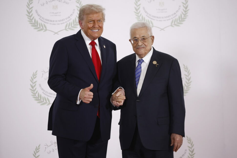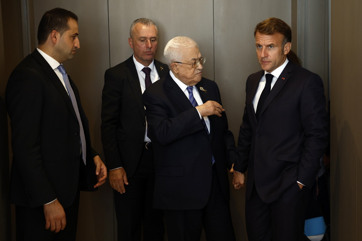 Ο Γάλλος πρόεδρος Εμανουέλ Μακρόν και ο πρόεδρος του Κράτους της Παλαιστίνης Μαχμούντ Αμπάς αποχωρούν μετά από συνάντηση κατά τη διάρκεια της Διεθνούς Συνόδου Ειρήνης για τη Γάζα στο Σαρμ Ελ Σέιχ της Αιγύπτου, στις 13 Οκτωβρίου 2025. EPA/YOAN VALAT /POOL