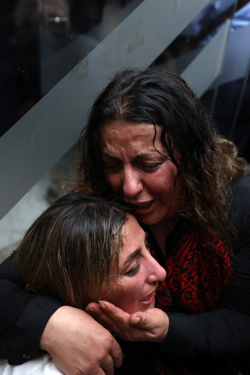 Γυναίκες κλαίνε γοερά, όταν έμαθαν ότι ο δικός τους άνθρωπος, ο οποίος αναμενόταν να απελευθερωθεί, δεν έφτασε μαζί με τους υπόλοιπους απελευθερωμένους Παλαιστίνιους κρατούμενους στην πόλη Ραμάλα της Δυτικής Όχθης, στις 13 Οκτωβρίου 2025. Πρώτη φάση της ειρηνευτικής συμφωνίας για τη Γάζα. EPA/ALAA BADARNEH