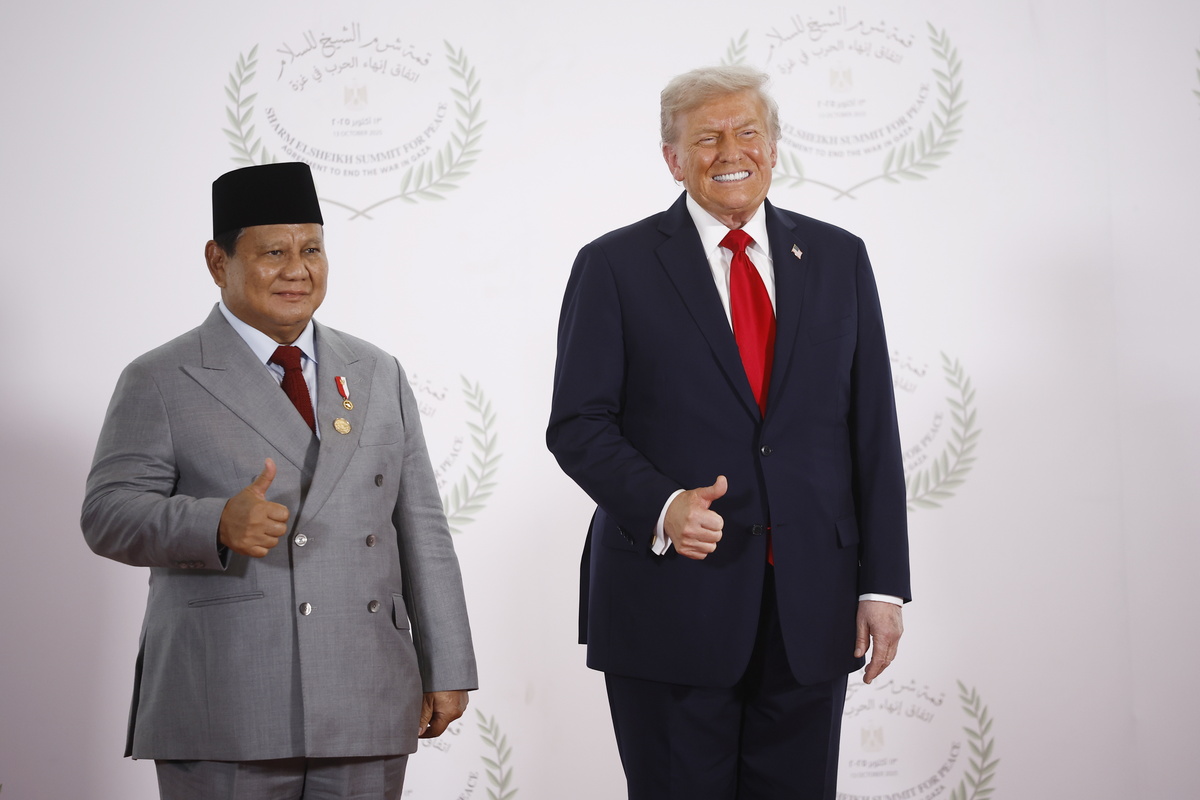 Thumbs up Mr. President! Ο Ρετζέπ Ταγίπ Ερντογάν και ο Ντόναλντ Τραμπ, ποζάρουν με τον αντίχειρα σηκωμένο, λίγο πριν τη διαδικασία λήψης της οικογενειακής φωτογραφίας των καλεσμένων ηγετών στη Σύνοδο Κορυφής για την Ειρήνη στη Γάζα στο Σαρμ Ελ Σέιχ της Αιγύπτου, στις 13 Οκτωβρίου 2025. EPA/YOAN VALAT / POOL.