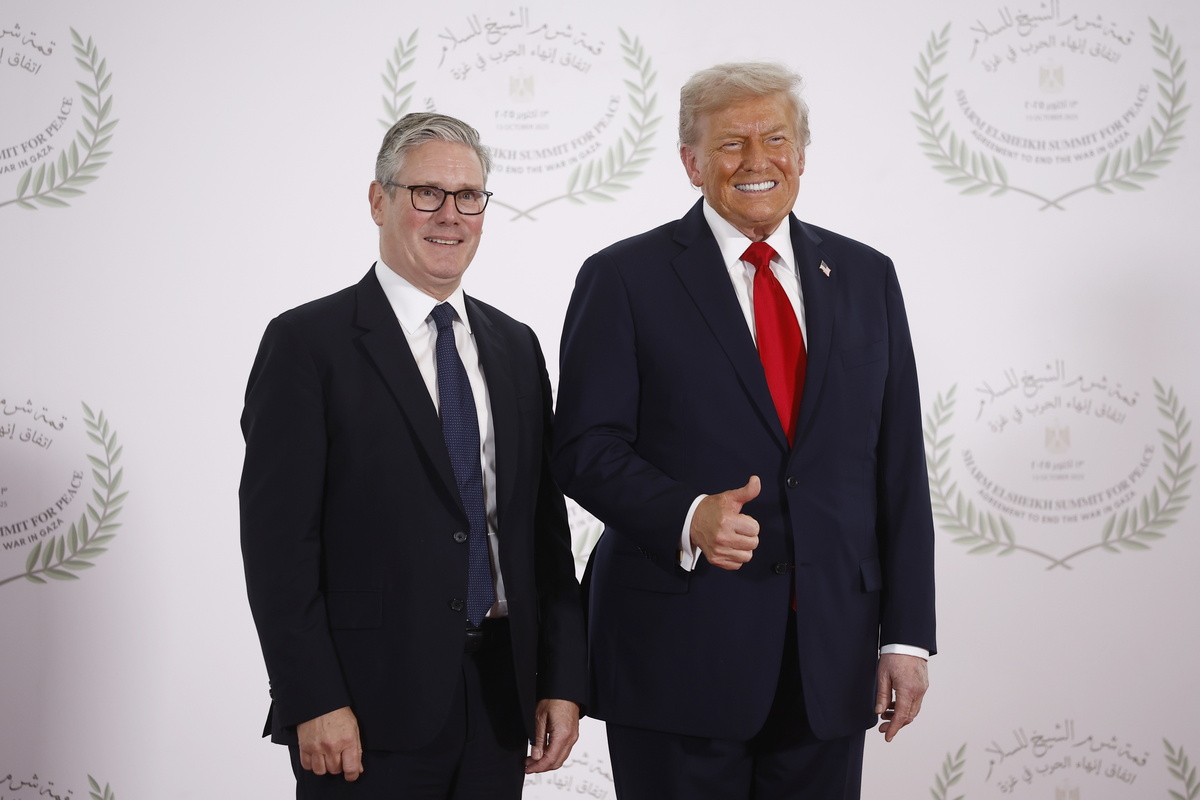 Ο Γάλλος πρόεδρος Εμανουέλ Μακρόν και ο Βρετανός πρωθυπουργός Κίρ Στάρμερ φτάνουν για μια διμερή συνάντηση στη Διεθνή Σύνοδο Ειρήνης της Γάζας στο Σαρμ Ελ Σέιχ της Αιγύπτου, στις 13 Οκτωβρίου 2025. EPA/YOAN VALAT /POOL