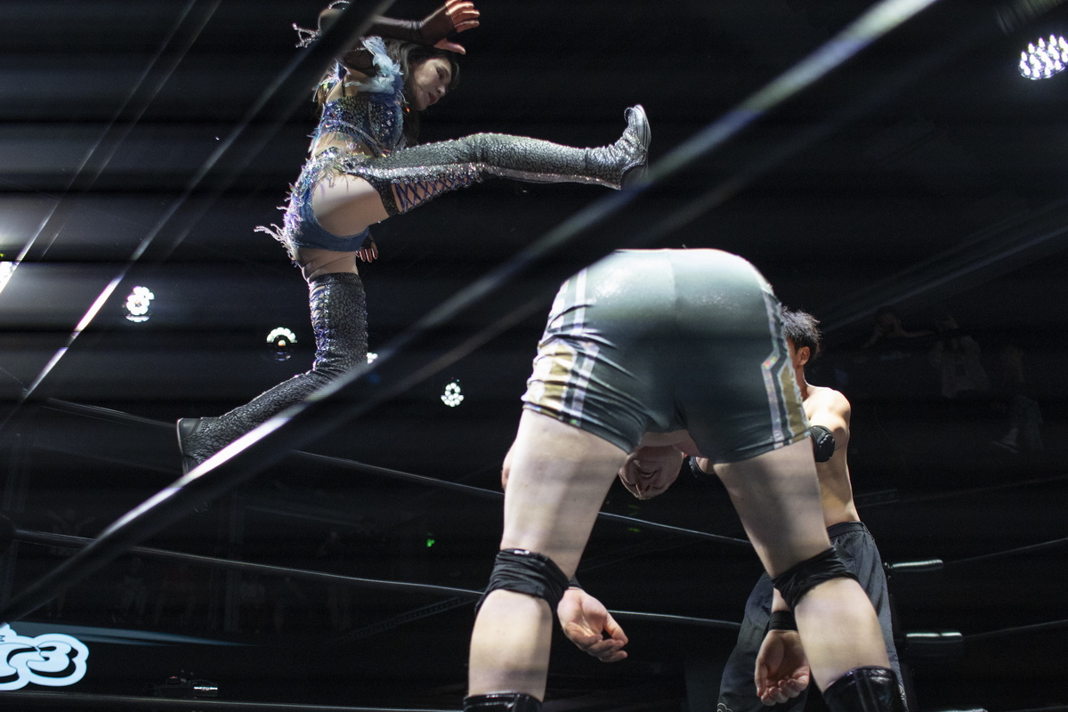 H αθλήτρια πάλης Yuki Kamifuku φτάνει στο ρινγκ, πριν από έναν αγώνα του «MKW Battle of the Decade» στο Πεκίνο, Κίνα, 24 Μαΐου 2025.