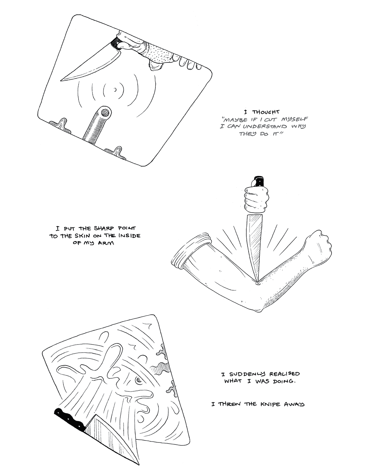 …σκέφτηκα ότι θα μπορούσα να κατανοήσω γιατί το κάνουν…άρχισα να καρφώνω τη μύτη του μαχαιριού στο δέρμα μου και τότε συνειδητοποίησα τι κάνω…πέταξα το μαχαίρι…