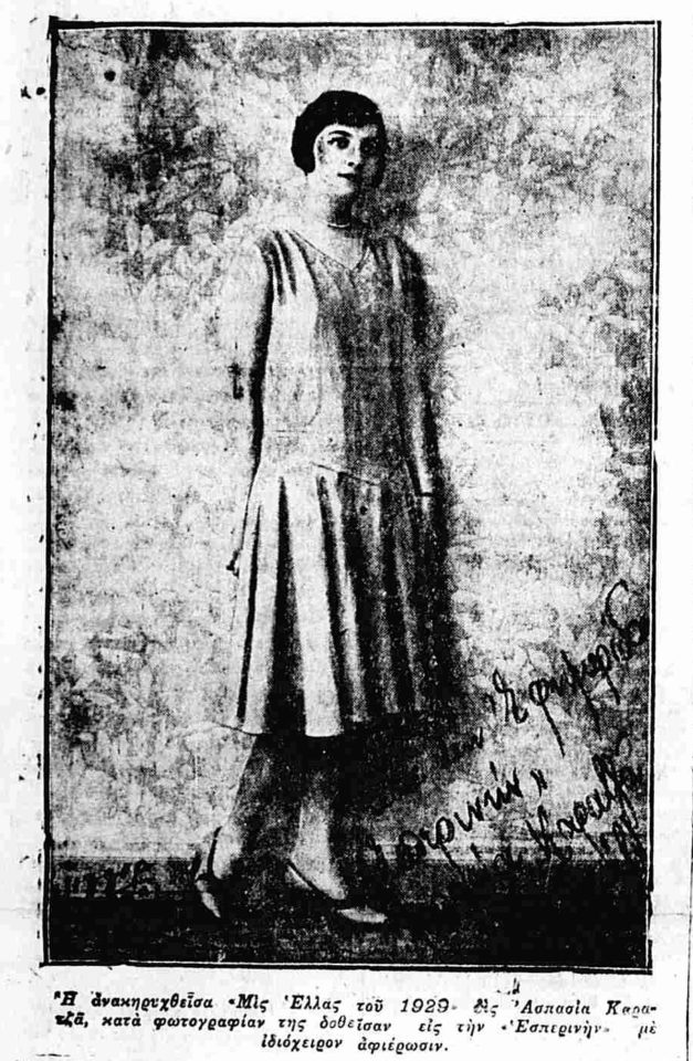 «Ασπασία Καρατζά. Η μις Ελλάς του 1929. Σας την παρουσιάζουμεν: Καλλονή όχι εντυπωσιακή, αλλά πραγματική. Χαρακτηριστικά γνησίως ελληνικά, σύμφωνα με τους κανόνας της συμμετρίας, που δίδουν δια τη γυναικείαν καλλονήν τα αριστουργήματα των Ελληνικών γλυπτών της αρχαιότητος. Αναστήματος μάλλον υψηλού. Μελαχρινή, σιταράτη, με μαλλιά καστανά. Ετών 23. Πατρίς αι Πάτραι.