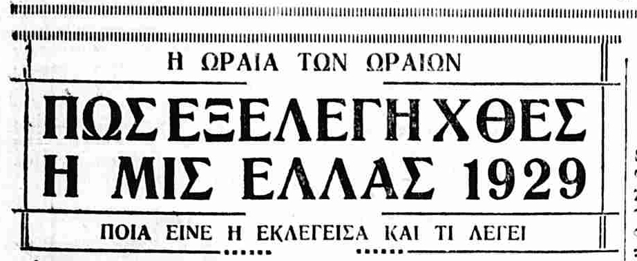 Στις 29 Δεκεμβρίου 1928 μια πρωτότυπη είδηση εμφανίζεται στο κέντρο της δεύτερης σελίδας της εφημερίδας Εμπρός. Η Ελλάδα θα συμμετέχει στον «διαγωνισμόν καλλονής» της Αμερικής. Από τον συντάκτη του μονόστηλου ενημερωνόμαστε πως το κοινό της εφημερίδας είναι ήδη εξοικειωμένο με το γεγονός ότι κάθε χρόνο στο «Γκλάβεστον της Πολιτείας του Τέξας εν Αμερική ενεργείται διεθνής διαγωνισμός καλλονής, εις τον οποίον αποστέλλονται από όλας τας χώρας του κόσμου αι ωραιότεραι δεποινίδες εκλεγόμεναι εις τας πατρίδας των υπό ειδικής ελανοδίκου επιτροπής και λαμβάνουσαι τα ονόματα της εθνικότητας εις ην ανήκουν…». Πληροφορούμαστε μάλιστα πως το έργο της εκλογής της ωραιότερης ελληνίδας έχει ήδη ανατεθεί στην Ένωση Συντακτών Αθηναϊκών Εφημερίδων όμως οι λεπτομέρειες των όρων δεν έχουν ακόμα κανονισθεί.