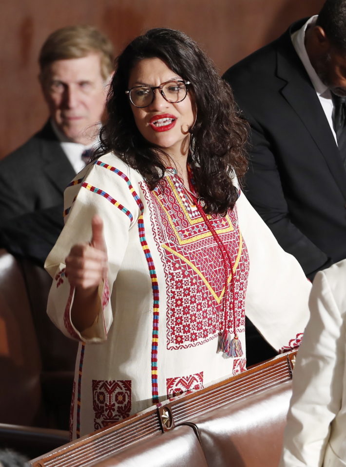 Η τέταρτη της ομάδας, Ρασίντα Τλάιμπ, μπήκε για πρώτη φορά στο Κονγκρέσο φορώντας παραδοσιακή φορεσιά της Παλαιστίνης, την οποία είχε ράψει η ίδια η μητέρα της, ενώ ορκίστηκε στο Κοράνι της οικογένειάς της λέγοντας πως, «ορκίστηκα στο Κοράνι γιατί ήθελα να δείξω πως ο λαός της Αμερικής είναι μια σύνθεση ανθρώπων με διαφορετικές ρίζες και πως όλοι μας αγαπάμε την δικαιοσύνη και την ελευθερία». Οι γονείς της Τλάιμπ γεννήθηκαν στην Παλαιστίνη και μετανάστευσαν στις ΗΠΑ σε νεαρή ηλικία, ενώ η γιαγιά της ζει ακόμα στην Δυτική Όχθη. Η 42χρονη Τλάιμπ, που είναι η μεγαλύτερη από τα 14 αδέρφια της, είναι ένα από τα λίγα μέλη του αμερικάνικου Κονγκρέσου που υποστηρίζει το κίνημα BDS κατά του Ισραήλ, το δικαίωμα επιστροφής των Παλαιστινίων στα εδάφη που τους αφαιρέθηκαν με την ίδρυση του κράτους του Ισραήλ, αλλά και μια λύση του παλαιστινιακού προβλήματος, που θα περιλαμβάνει ένα μόνο κράτος. Ειδικά η υποστήριξη που έχει δείξει για το κίνημα BDS, την έχει κάνει πολλές φορές στόχο των πολιτικών της αντιπάλων, ενώ η κυβέρνηση του Μπέντζαμιν Νετανιάχου της απαγόρευσε την είσοδο στην χώρα.