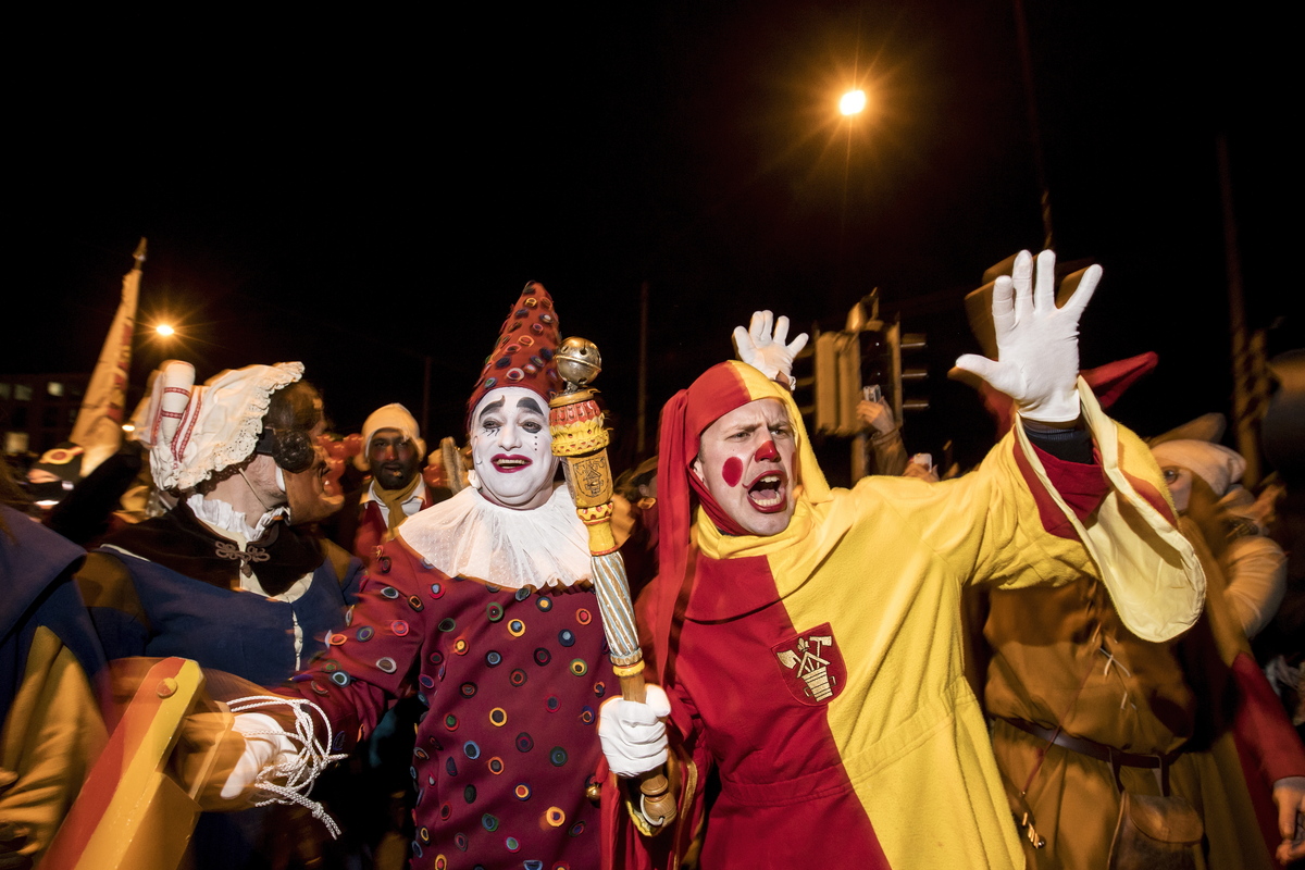 epa07403331 Costumed revelers pose in front of the Chapell bridge on the opening day of the Carnival in Lucerne, Switzerland, 28 February 2019. The carnival takes place from 28 February to 05 March. EPA/ALEXANDRA WEY