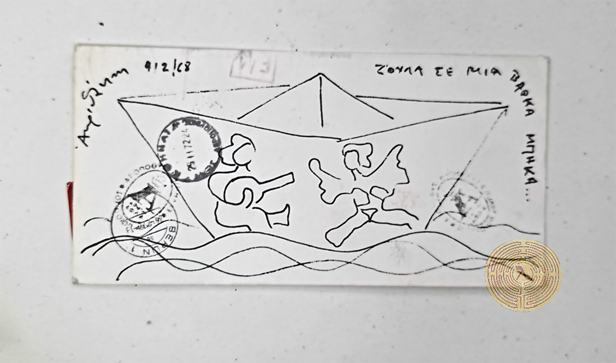 Ακολουθεί αυτούσια η πολύτιμη επιστολή-ντοκουμέντο, την οποία οποία ο Ακριθάκης έστειλε από το Βερολίνο, σε καρτ ποστάλ σχεδιασμένη από τον ίδιο: